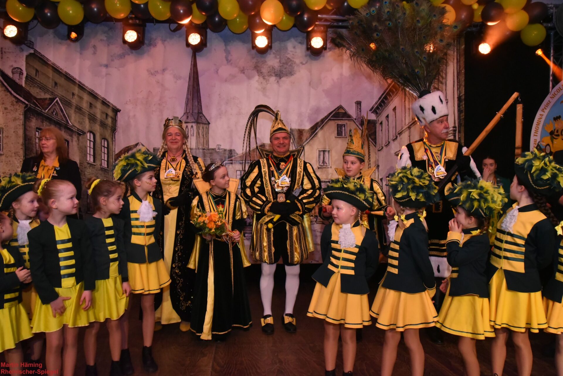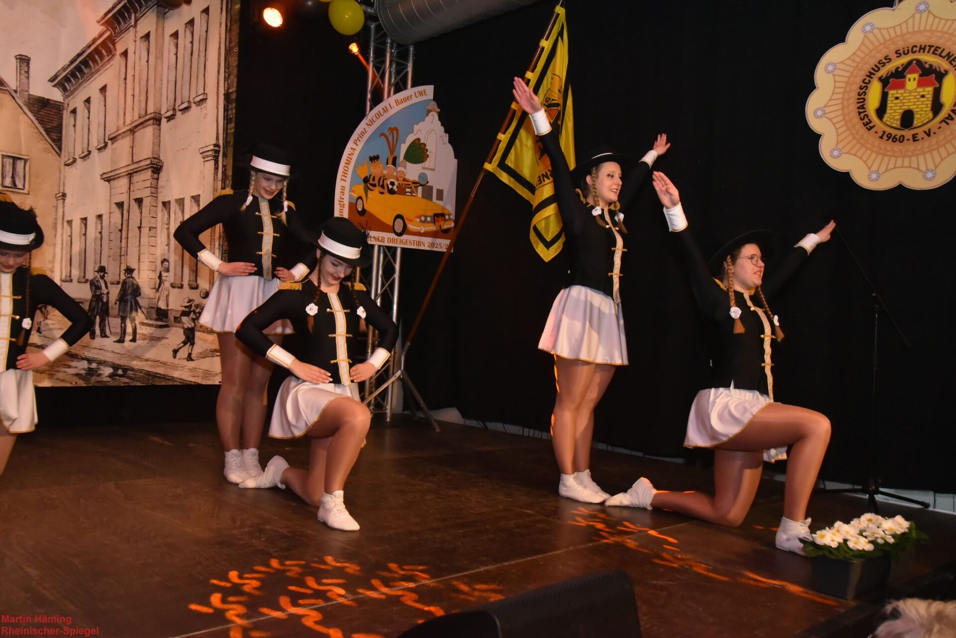 Und kaum waren die Kinderapplaus-Feuerwerke etwas leiser geworden, gesellte sich das Süchtelner Dreigestirn dazu: Prinz Nicolai I., Jungfrau Thomas „Thomina“ und Bauer Uwe — eine Einheit, die in Kostüm, Haltung und Schalkhaftigkeit das Publikum sofort in ihren Bann zog. Gemeinsam formten sie das große Bild, das jeder Karnevalsszene die majestätische Würze verleiht.