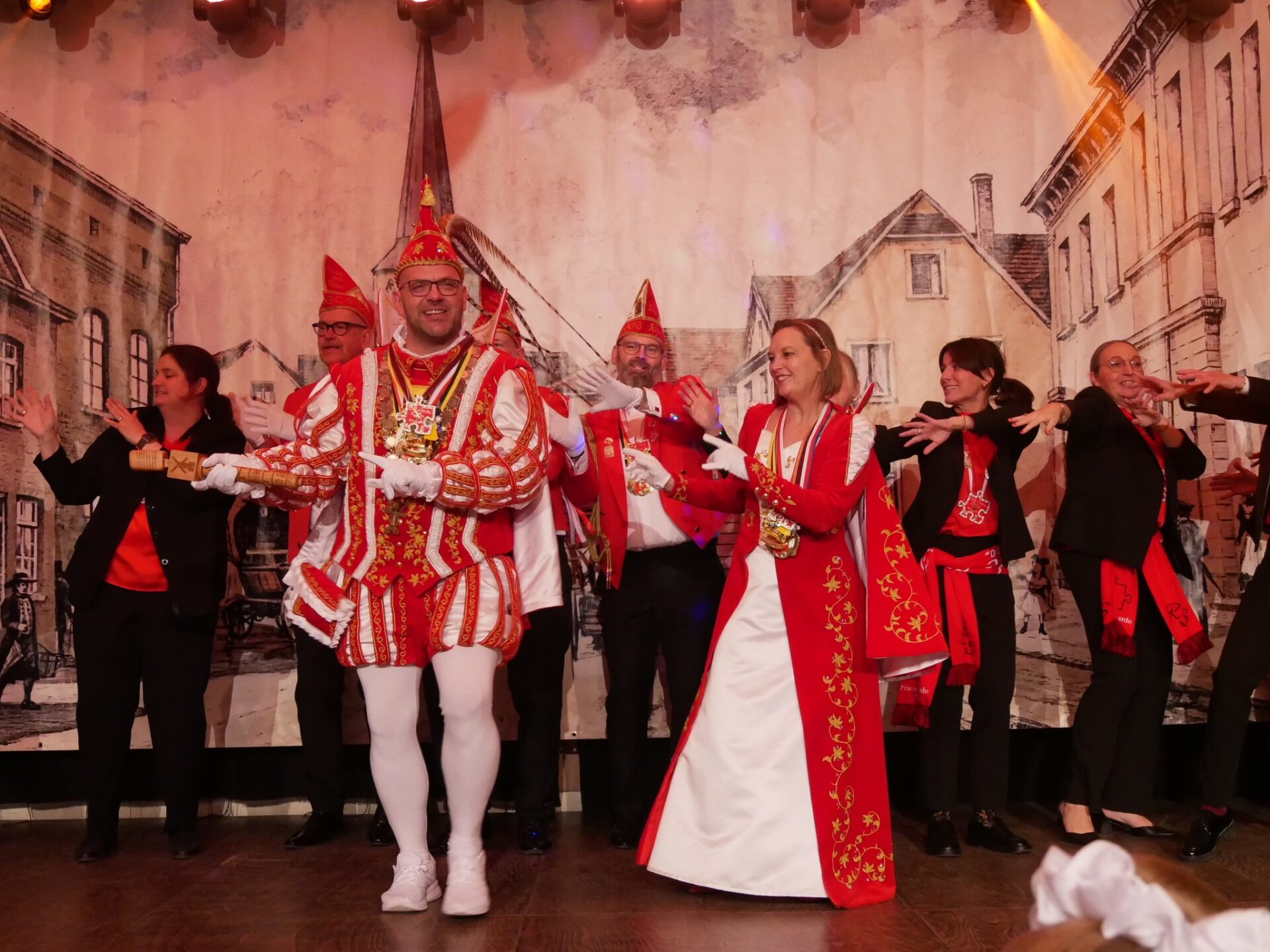 Der Garde-Tanz kam anschließend als Ensemblenummer — die Mitglieder der Süchtelner Prinzengarde wirbelten über die Bretter, und man hatte den Eindruck, als hätte die Zeit kurz stillgestanden. Dann nahte ein weiterer offizieller Auftritt: das Prinzenpaar von Viersen, Prinz Wolfgang III. und Prinzessin Estefania I., geleitet von ihrer Begleitung, betrat die Bühne — ein Auftritt, der würdevoll begann und in der Folge als Prolog zum wohl erwarteten Höhepunkt des Tages diente.