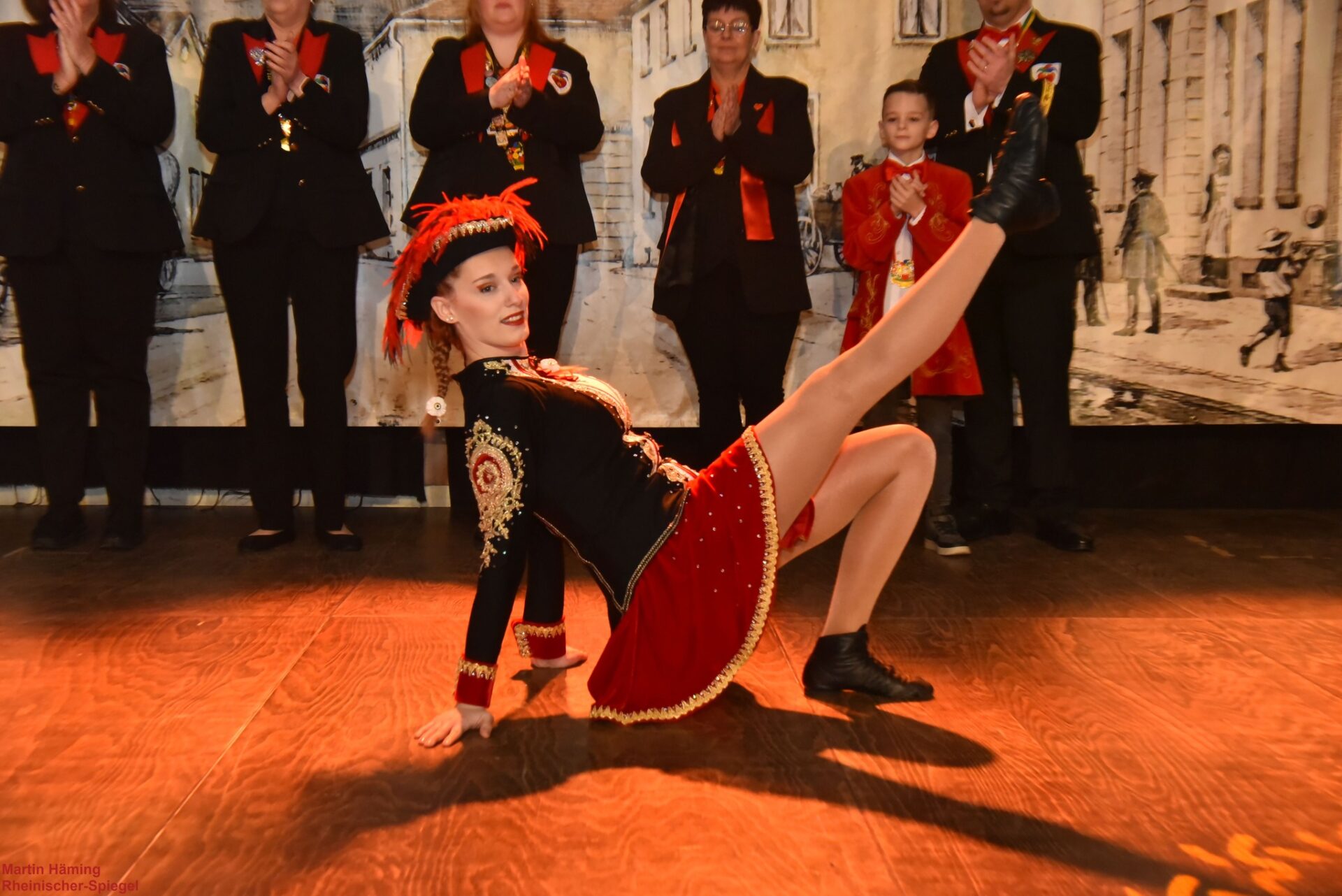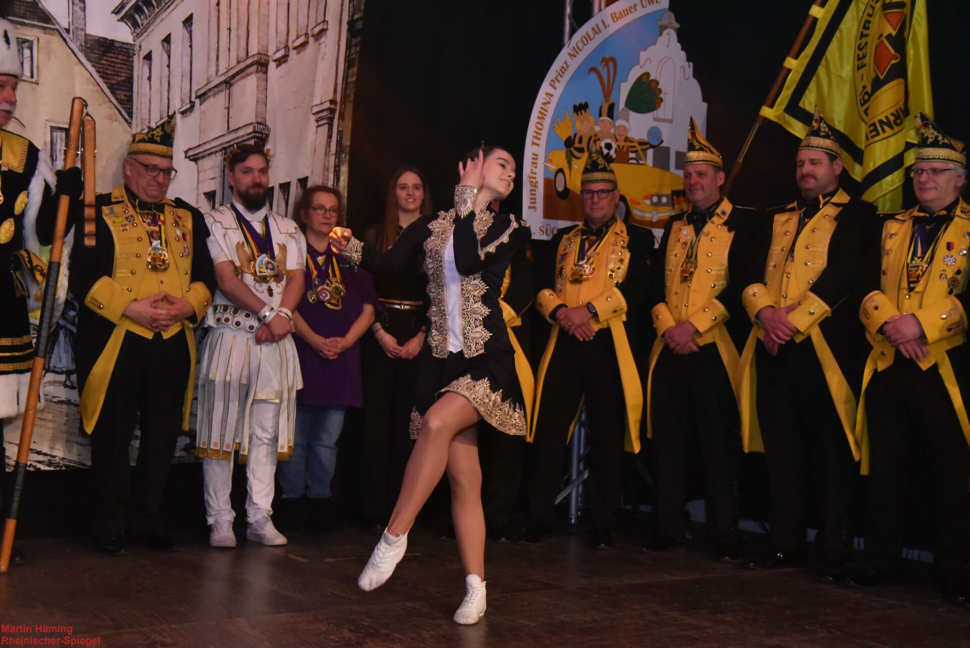 Dann explodierte der Saal nochmal, als Solomariechen Laura erschien. Wahre Energie wurde in die Luft geworfen: sie wirbelte, sprang, landete — und der Boden vibrierte förmlich unter den Schritten. Laura wurde begleitet von ihrer Heimat, der Süchtelner Prinzengarde — eine Formation, die seit 2004 besteht und in zwei Jahrzehnten aus einer spontanen Idee eine Institution aufgebaut hat. Die Prinzengarde zeigte nicht nur ihr Können als Ensemble, sondern auch die Bande zur Förderung junger Talente: Lauras Auftritt war der lebende Beweis, dass dieser Geist von Generation zu Generation weitergegeben wird.