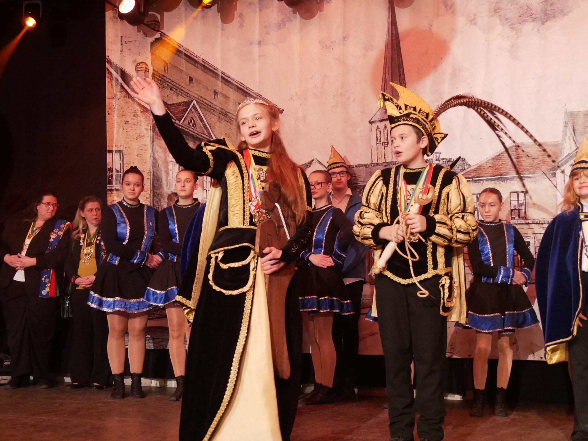 Zunächst stürmte die KG De Brook Müerkes auf die Bühne: das bezaubernde 57. Süchtelner Kinderprinzenpaar — Kinderprinz Jonas II. und Kinderprinzessin Hannah II. — präsentierte sich mit der routinierten Selbstsicherheit junger Regenten. Zwei kleine Monarchen, deren Auftritt wie eine perfekt getimte Serie aus Strahlen, höfischem Winken und gekonnter Choreografie wirkte; die Reihen der Karnevalisten waren ein Meer aus Handys und stolzen Blicken.