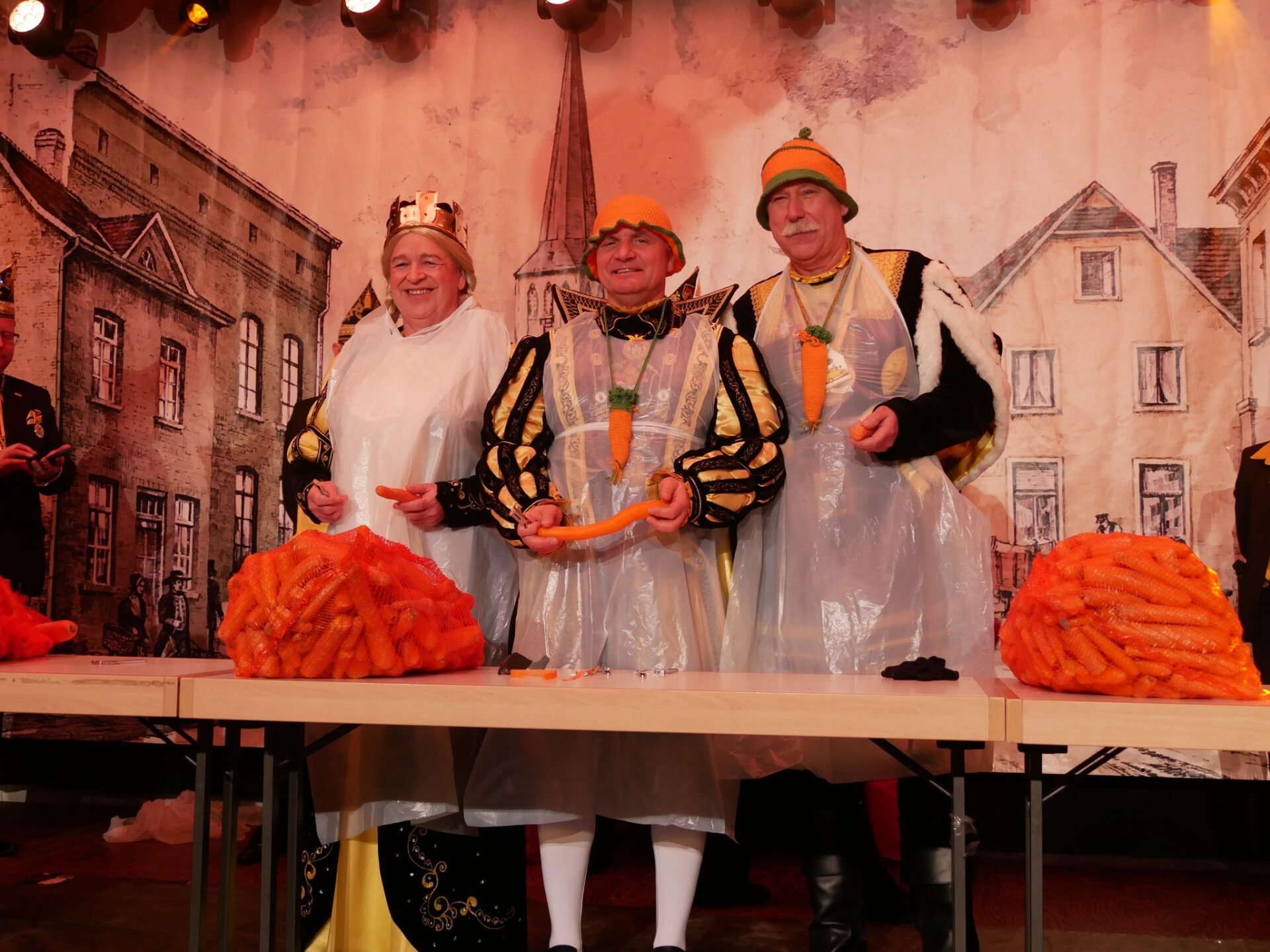 Und dann: die Messer wurden gezückt. Das Möhrenschälen begann in echter Wettkampfatmosphäre — musikalisch untermalt von „Dalli, Dalli“, mit blitzenden Klingen und flotten Sprüchen, die durch den Saal peitschten. Prinz Nicolai I., Jungfrau Thomas „Thomina“ und Bauer Uwe stellten sich dem Test der Fingerfertigkeit: 11 Minuten und 11 Sekunden Möhrenschälen gaben den Takt vor — ein närrisches Zeitfenster, das in sich schon Symbolik und Theater vereinte.