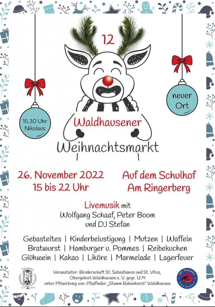 Traditionell findet der Waldhausener Weihnachtsmarkt am Samstag vor dem 1. Advent statt. Nachdem im vergangenen Jahr die Veranstaltung in letzter Minute abgesagt werden musste, ist es nun endlich wieder soweit: Der 12. Waldhausener Weihnachtsmarkt öffnet seine Pforten am Samstag, dem 26. November 2022, um 15.00 Uhr auf dem Schulhof Am Ringerberg.