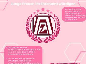 Der ZONTA Club Viersen ruft zur Bewerbung beim „YOUNG WOMEN IN PUBLIC AFFAIRS AWARD“ auf. Viersen – „Du bist eine 16- bis 19-jährige junge Frau, die eine weiterführende Schule besucht, […]