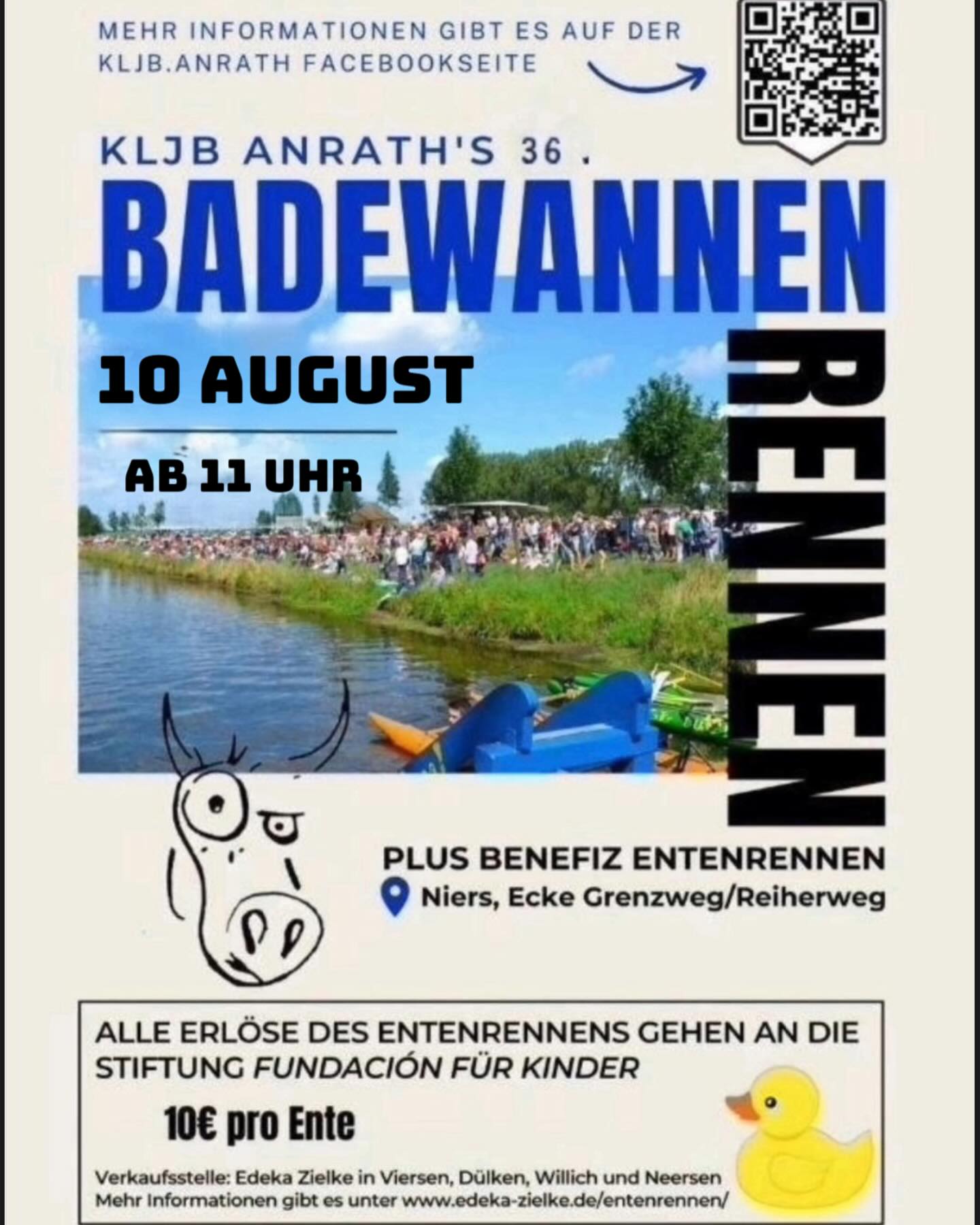 Am Sonntag, den 10.8.2025. findet ab 11:00 Uhr das 36. Badewannenrennen auf der Niers statt.