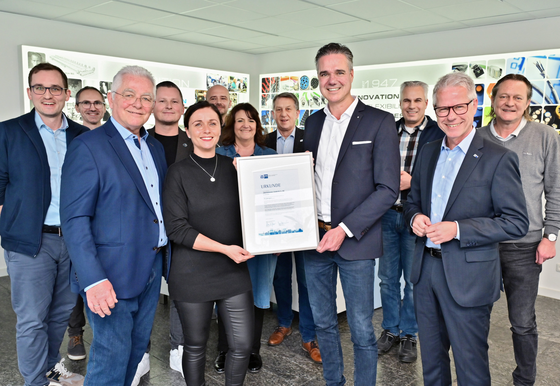 Viersen-Süchteln – Zum Jubiläum der SAB Bröckskes GmbH & Co. KG gratulierten Elmar te Neues, Präsident der Industrie- und Handelskammer (IHK) Mittlerer Niederrhein, und IHK-Hauptgeschäftsführer Jürgen Steinmetz. Sie überreichten Peter Bröckskes (Sohn des Gründers) und Sabine Bröckskes-Wetten (Enkelin des Gründers) eine Urkunde. „Die IHK Mittlerer Niederrhein freut sich, dass dieses faszinierende Unternehmen mit großer Kompetenz und viel Innovationsfreude seit so vielen Jahren erfolgreich ist“, sagte te Neues. „Wir wünschen dem Unternehmen weiterhin viel Erfolg und eine gute Zukunft“, ergänzte Steinmetz und bedankte sich auch für das große Engagement der SAB Bröckskes GmbH & Co. KG insbesondere im Bereich Ausbildung.