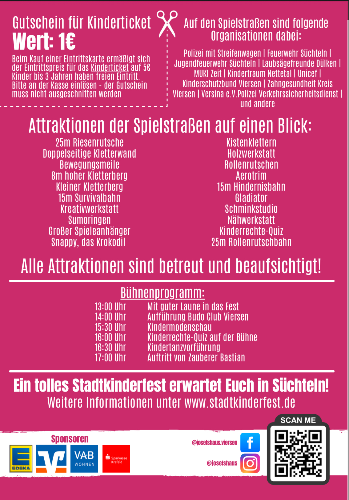 Zahlreiche Organisationen aus der Region sind mit dabei, darunter MUKI Zeit, Kindertraum Nettetal, Unicef, Polizei und Feuerwehr Süchteln, Jugendfeuerwehr Süchteln, Laubsägefreunde Dülken, Kinderschutzbund Viersen, Zahngesundheit Kreis Viersen und der Verkehrssicherheitsdienst Versina e. V. Sie bieten spannende Mitmachaktionen und Informationen rund um Kinderrechte, Sicherheit und Gesundheit.