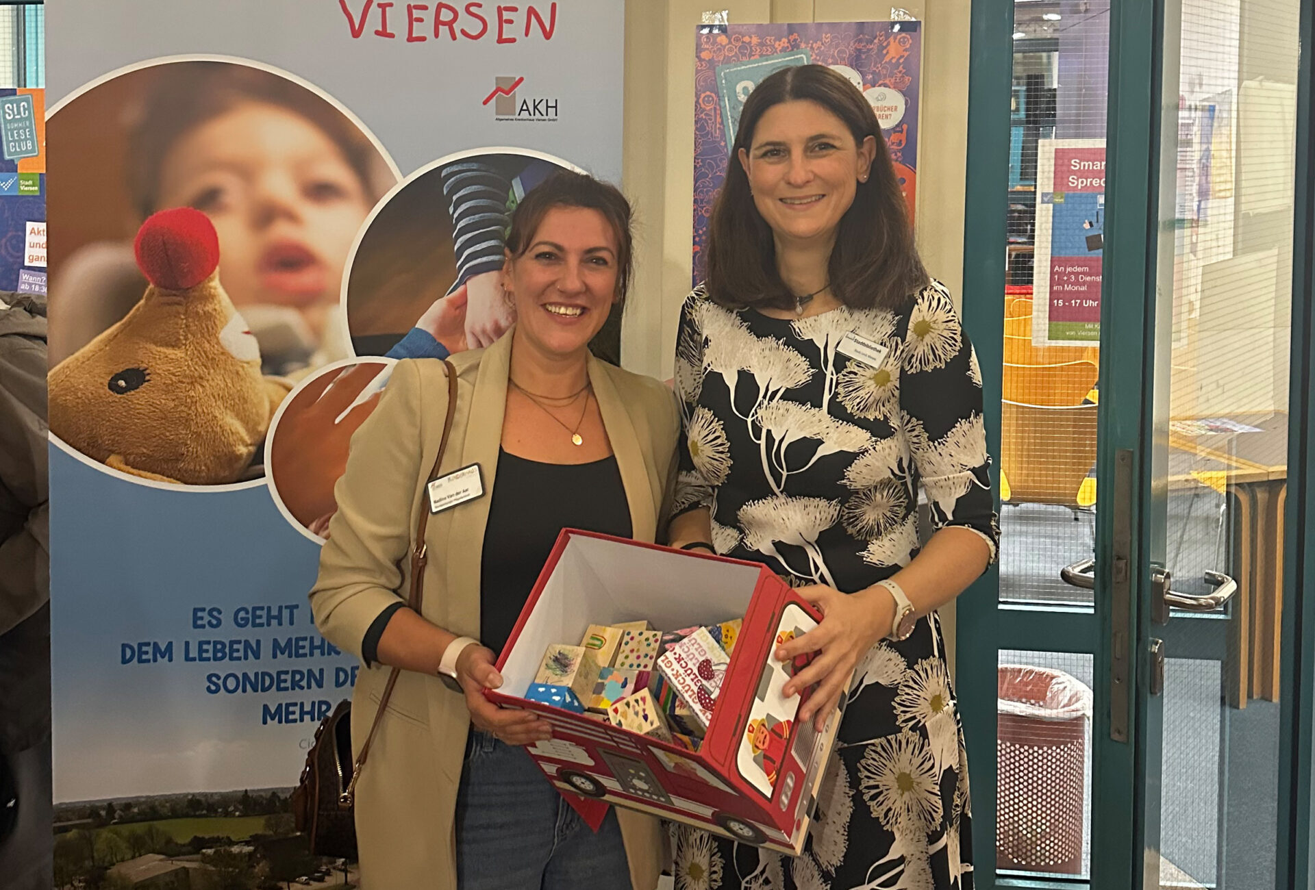 Die im dritten Clubtreffen unter der Anleitung von Steffi Verfürth und Inge Schäben-Buscher entstandenen „Mutmachwürfel“ wurden an Nadine van der Aar vom Kinderhaus Viersen übergeben. Hier finden schwerstmehrfachbehinderte und dauerbeatmete Kinder ein pflegerisch adäquates und liebevolles Zuhause. Nadine van der Aar gab einen kurzen Einblick in das Leben im Kinderhaus und dankte herzlich für die liebevoll gestalteten Würfel.
