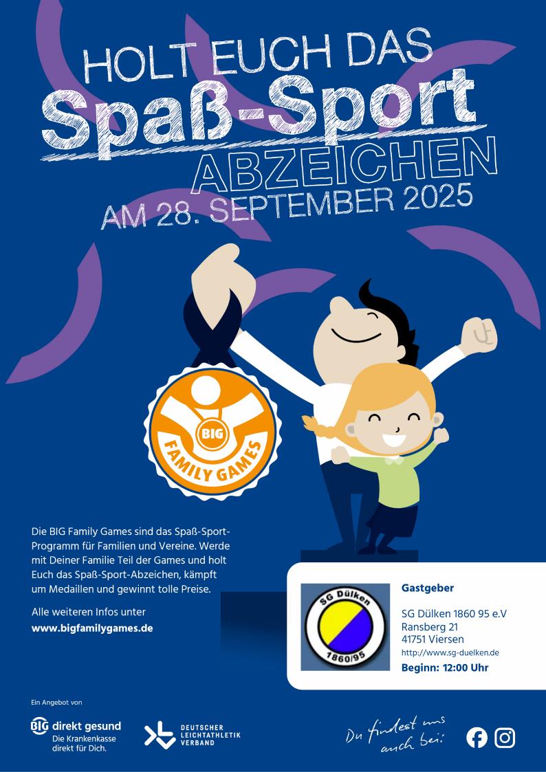 Die SG Dülken 1860/95 e.V. veranstaltet am 28.09.2025 die BIG Family Games mit Tag der offenen Tür. Für Speisen und Getränke ist gesorgt einfach ab 12.00 Uhr vorbeikommen.