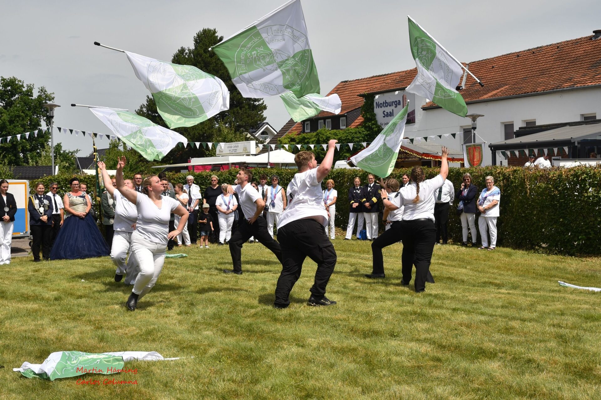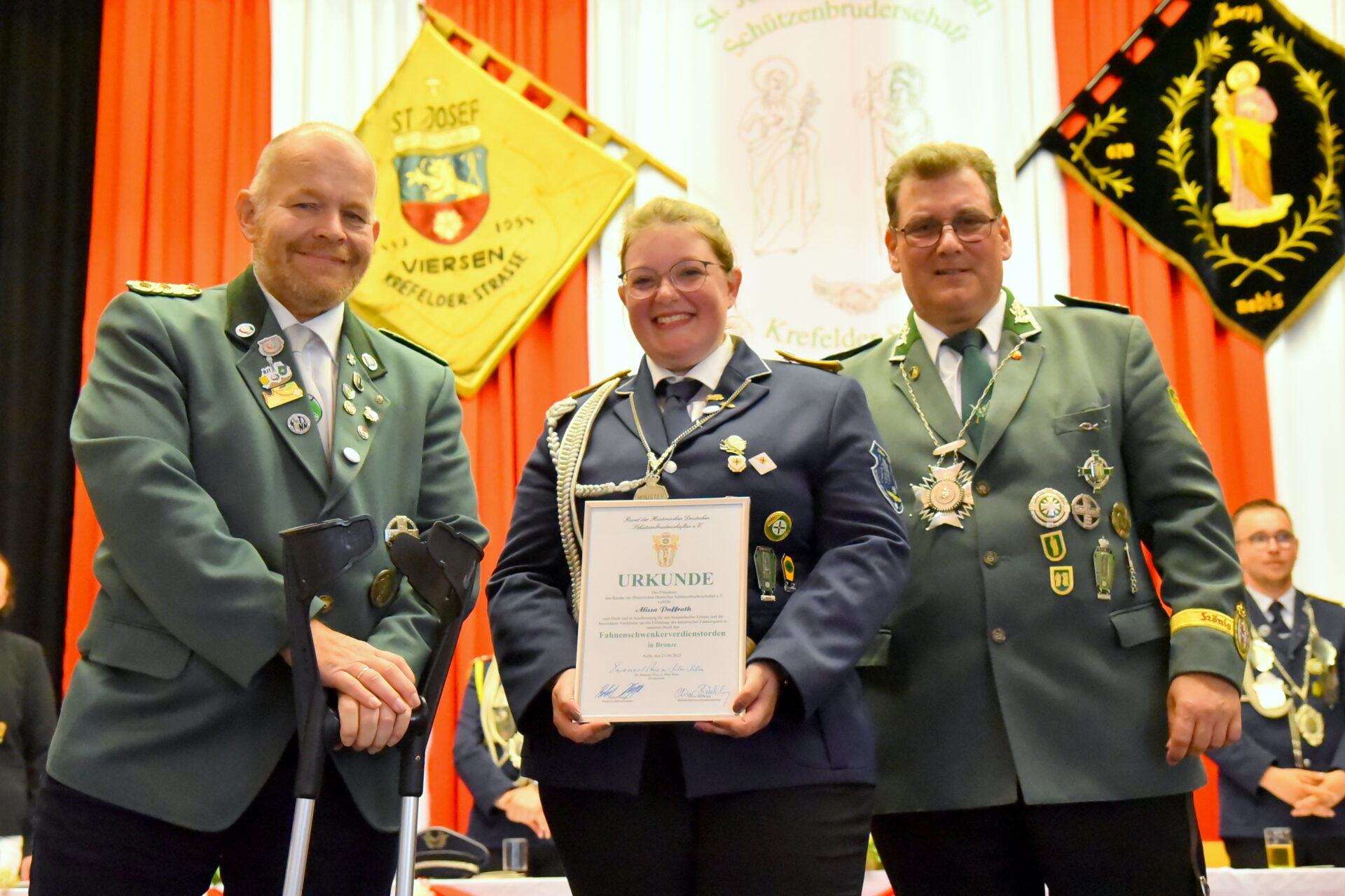 Am Casino in der Flämischen Allee wurde traditionell der große Zapfenstreich gespielt, bevor der musikalische Frühschoppen im Notburgasaal den stimmungsvollen Ausklang des Festwochenendes einleitete. Auch an diesem Tag wurden verdiente Mitglieder geehrt: Wolfgang Buschhausen für 40 Jahre Treue zur Bruderschaft, Alissa Paffrath mit dem Fahnenschwenker-Verdienstorden in Bronze.