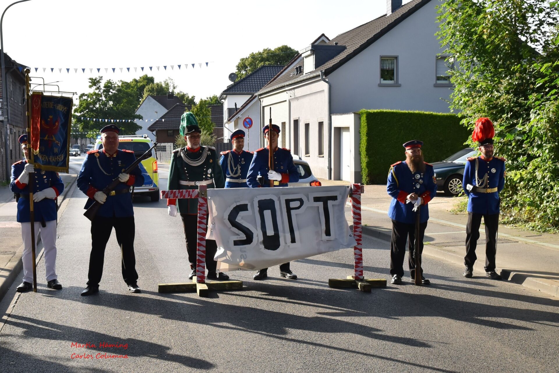 Der Freitagabend stand ganz im Zeichen des traditionellen Starts des Schützenfestes. Nach dem Antreten der Bruderschaft in Hülsdonk und dem feierlichen Ausmarsch zum Maibaumaufstellen am Hormesfeld zog es alle in den Notburgasaal, wo der Schützenball eröffnet wurde. Doch bevor das Tanzparkett gefüllt wurde, musste die Bruderschaft einen symbolischen Wegezoll leisten. Die Infanterie der St. Notburga-Bruderschaft überreichte in Uniform die Einreisegenehmigung, unterstützt von weiteren Gruppierungen.