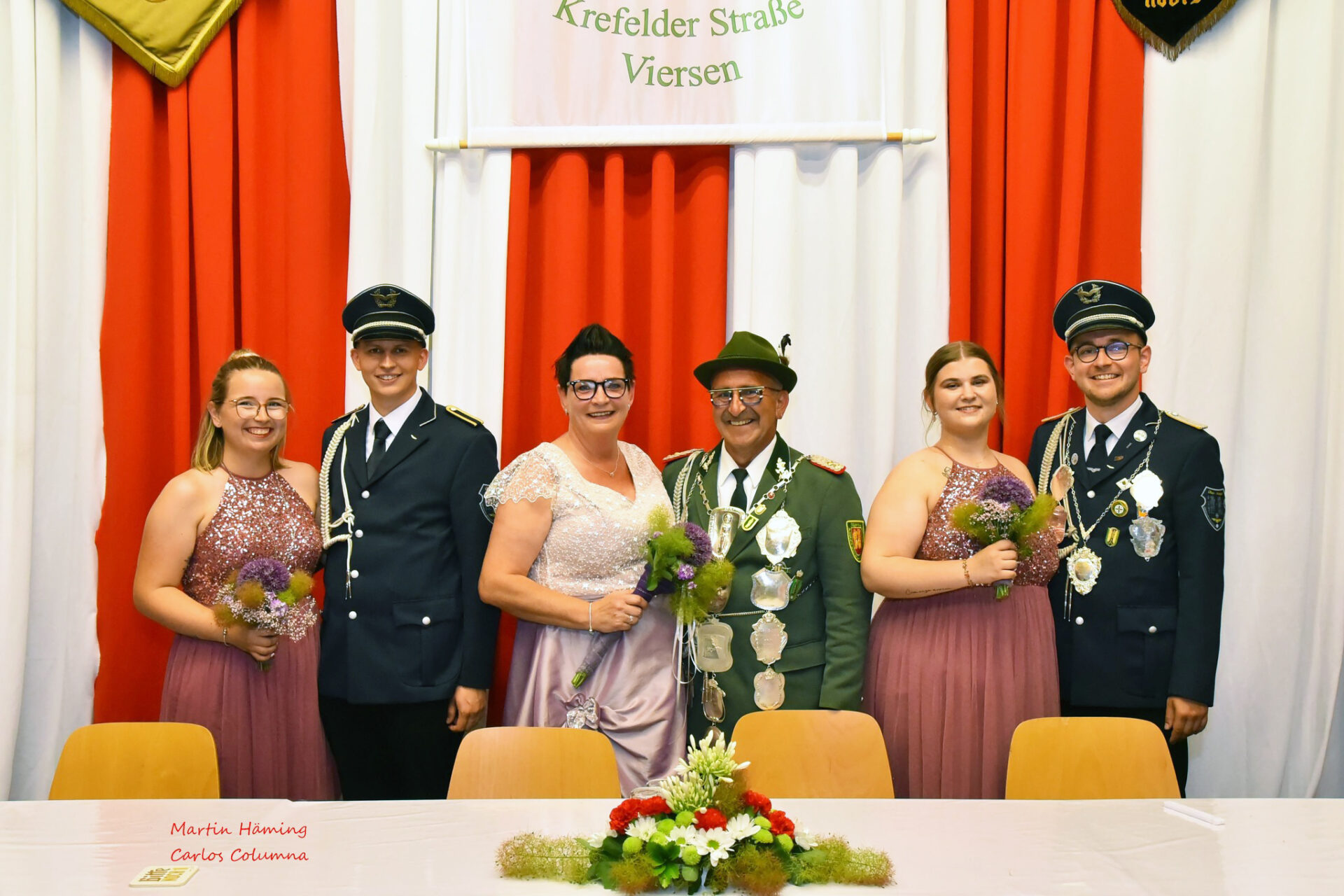 Am Samstag zogen Schützen und Gäste erneut durch Viersen – mit Zwischenstopps zum Abholen des Königshauses und zur Kranzniederlegung. Abends folgte der prunkvolle Königsgalaball. Dirk Bergs, der amtierende König, hatte den hölzernen Vogel im vergangenen Jahr mit dem 495. Schuss erlegt. Zum 20-jährigen Jubiläum seiner ersten Regentschaft übernahm er nun erneut das Amt und ernannte seine Kinder Anna-Lena und Patrick zu Ministern – ein klares Zeichen familiärer Verbundenheit und generationsübergreifender Tradition. Auch dieser Abend war geprägt von emotionalen Ehrungen: Lukas Luhnen, Heike Schneider, Anna-Lena Bergs und Ulrike Schippers erhielten das Silberne Verdienstkreuz. Dirk Bergs selbst wurde für seine jahrzehntelange aktive Mitgliedschaft mit dem Hohen Bruderschaftsorden ausgezeichnet.