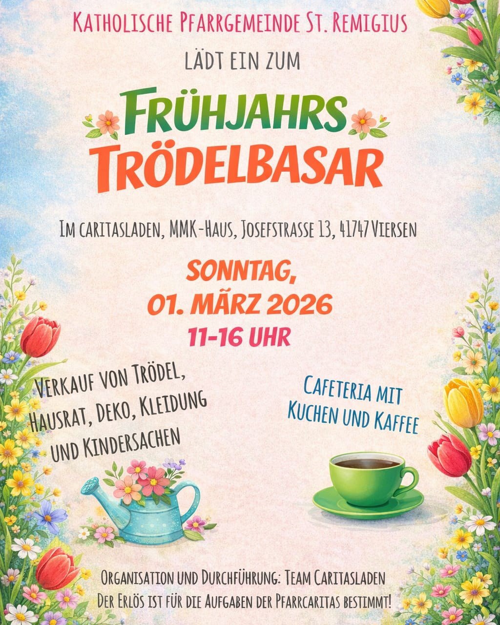 Viersen – „Am Sonntag, 1. März 2026, laden wir euch herzlich zu unserem Frühjahrs-Trödelbasar in den Caritasladen im MMK-Haus ein.