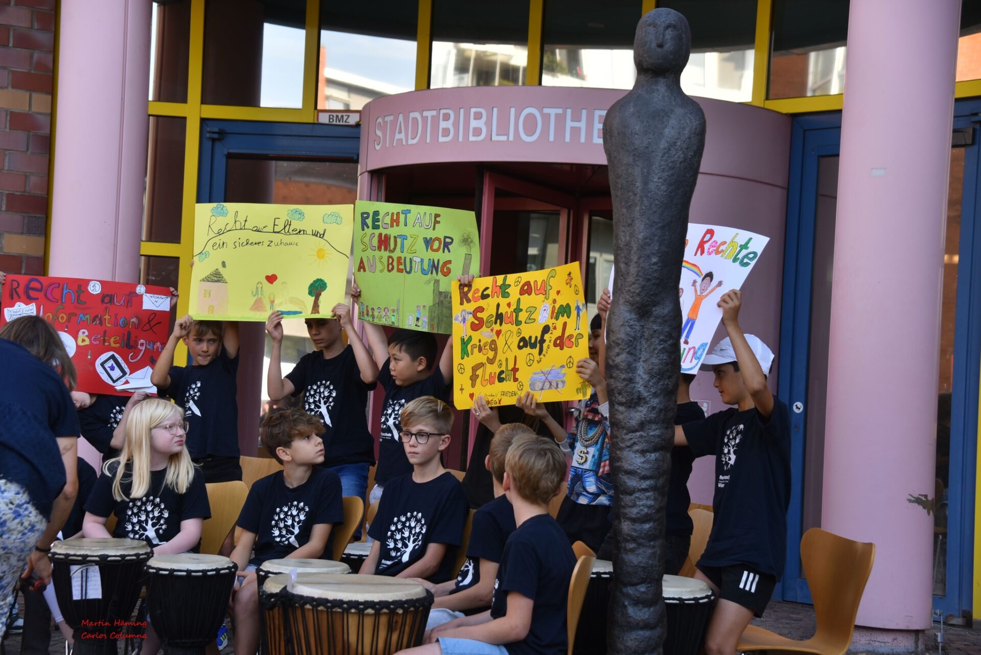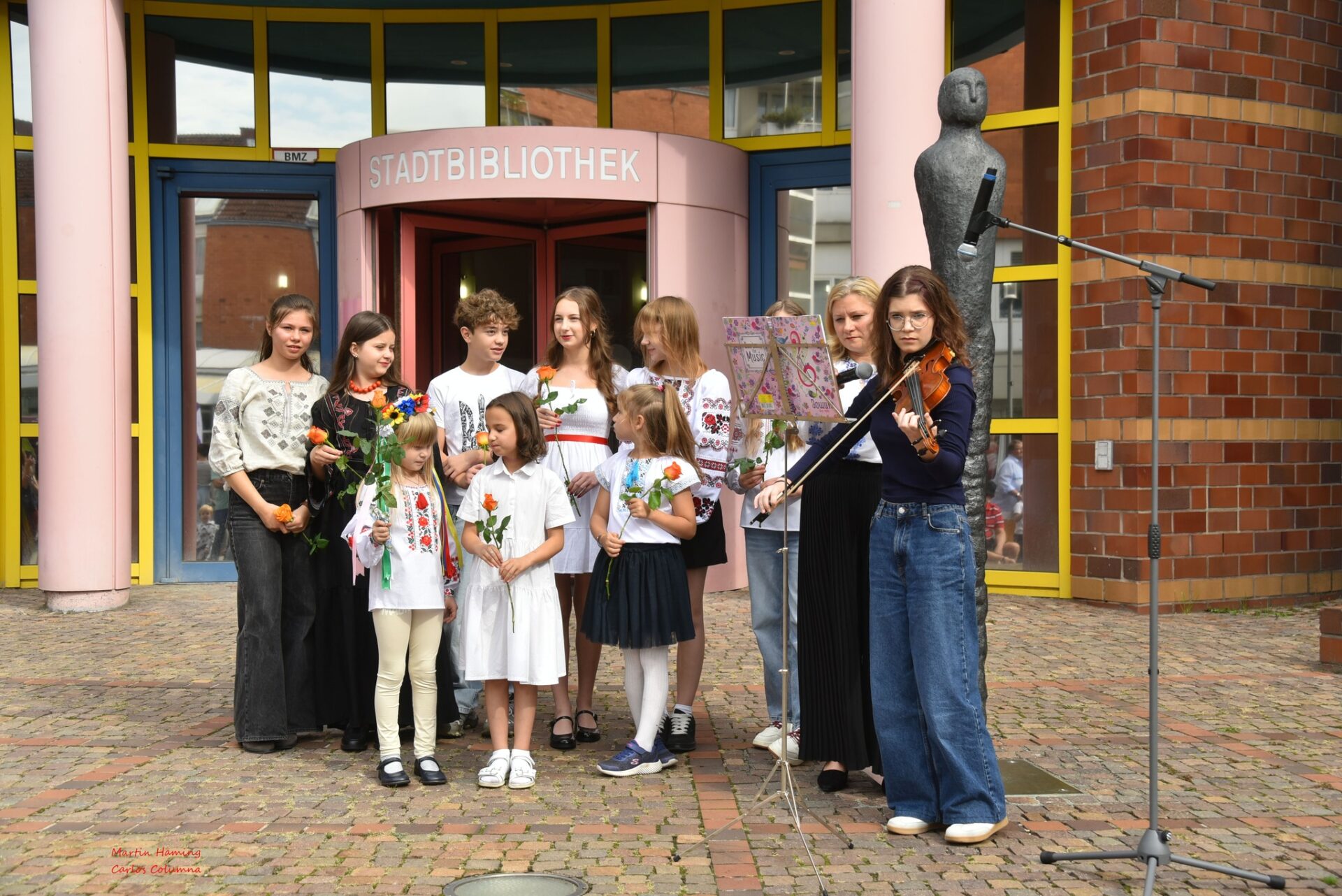 Das Herz des Festes schlug jedoch auf den Stufen der Stadtbibliothek. Dort gehörte die Bühne allein den Kindern. Mit einem Rhythmus, der direkt in Bauch und Beine ging, trommelten die Schüler der Remigiusschule. Kurz darauf erlebte das Publikum staunend eine Win-Tsun-Vorführung – fließende Bewegungen, mal schnell, mal kontrolliert, wie ein Tanz aus Kraft und Konzentration. Dann wurde es zart und verspielt: Die „Kleinen Sternchen“ hüpften über die Bühne, ihre Tanzschritte erzählten von Leichtigkeit und Freude.