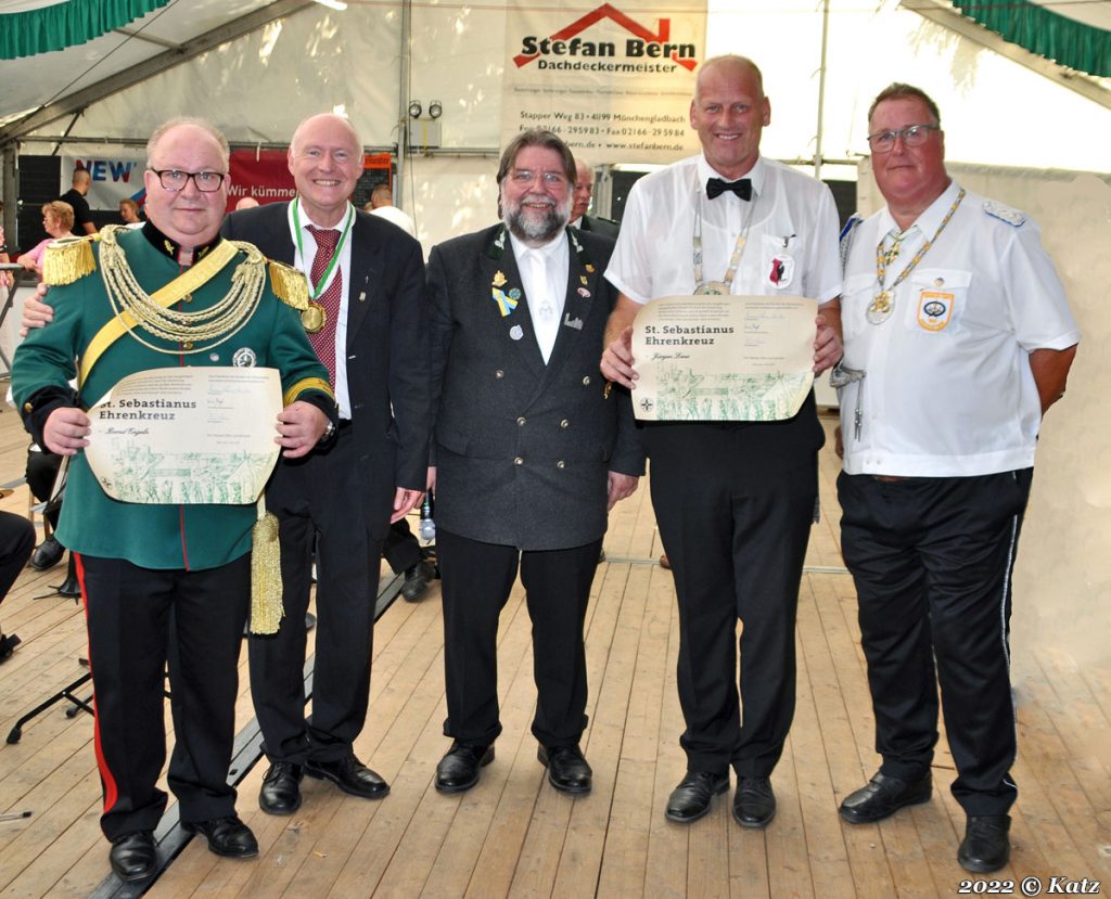 Nach der Parade vor dem Jungkönigshaus, Präses, Brudermeister, Bezirksbundesmeister mit Bruderratsvertreter und Senioren vom Caritaszentrum Rheydt am Martinshof, ging es ins Festzelt. Hier wurden weitere Bruderschaftler geehrt.