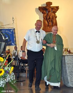 Bezirksbundesmeister Horst Thoren nahm nun die Ehrung vor. Präses Pfarrer Michael Schicks wurde mit dem St. Sebastianus-Ehrenschild am Bande für Präsides ausgezeichnet. Das ist eine besondere und seltene Ehrung. Der Geehrte ist seit 2008 Mitglied der Bruderschaft.