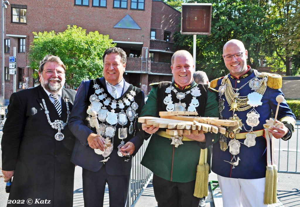 Mönchengladbach – Als Minister stehen ihm die beiden Schützen, die vor ihm geschossen haben zur Seite. Das sind Christoph Fels von der St. Barbara Bruderschaft Neuwerk und Udo Nösen von der St. Michaels Bruderschaft Holt.