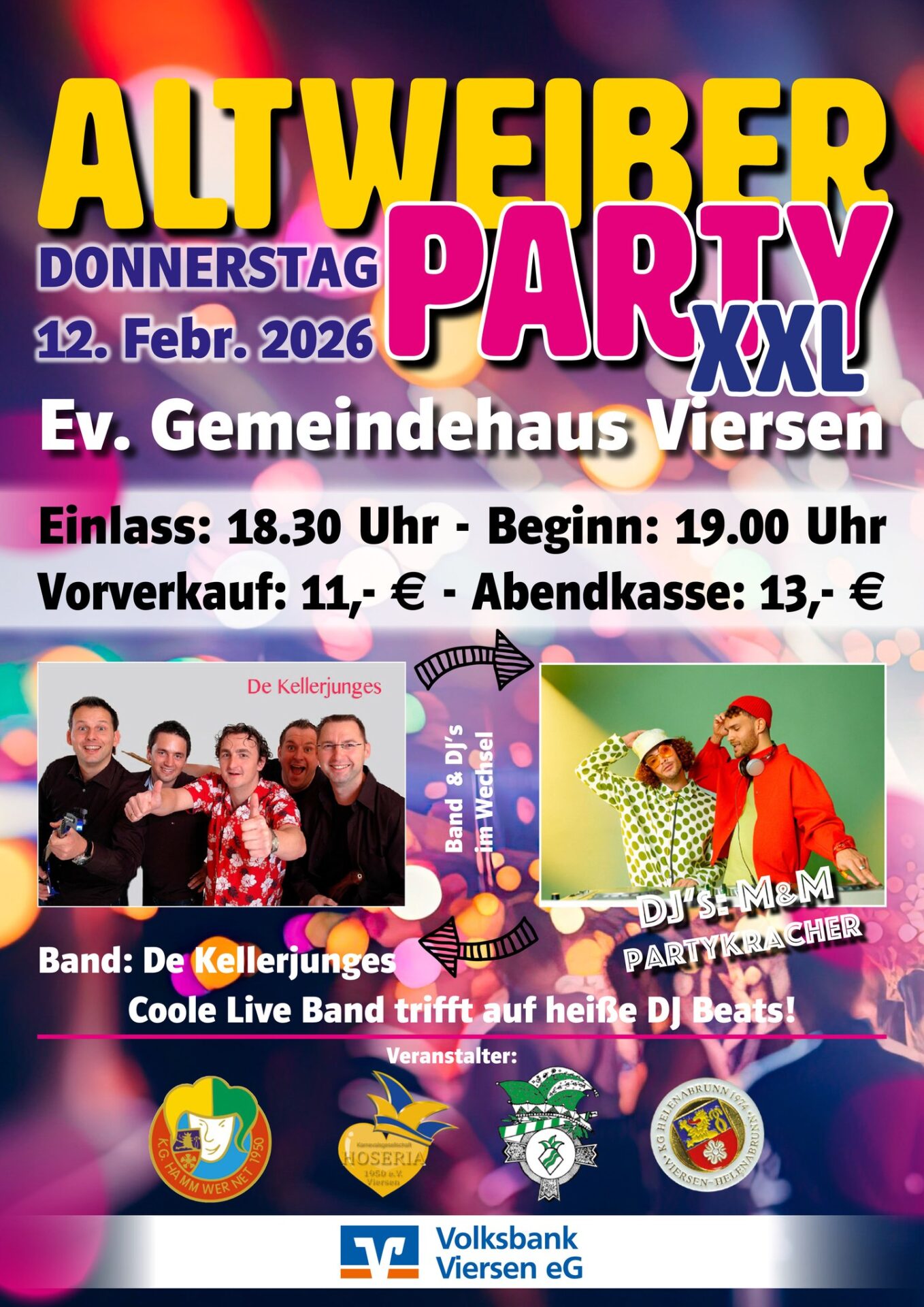 Die große Altweibersause in Alt-Viersen. Die Jrön Wette, Hamm, Helenabrunn & Hoseria bringen die erste gemeinsame Altweiber Party XXL in Alt-Viersen aufs Parkett.