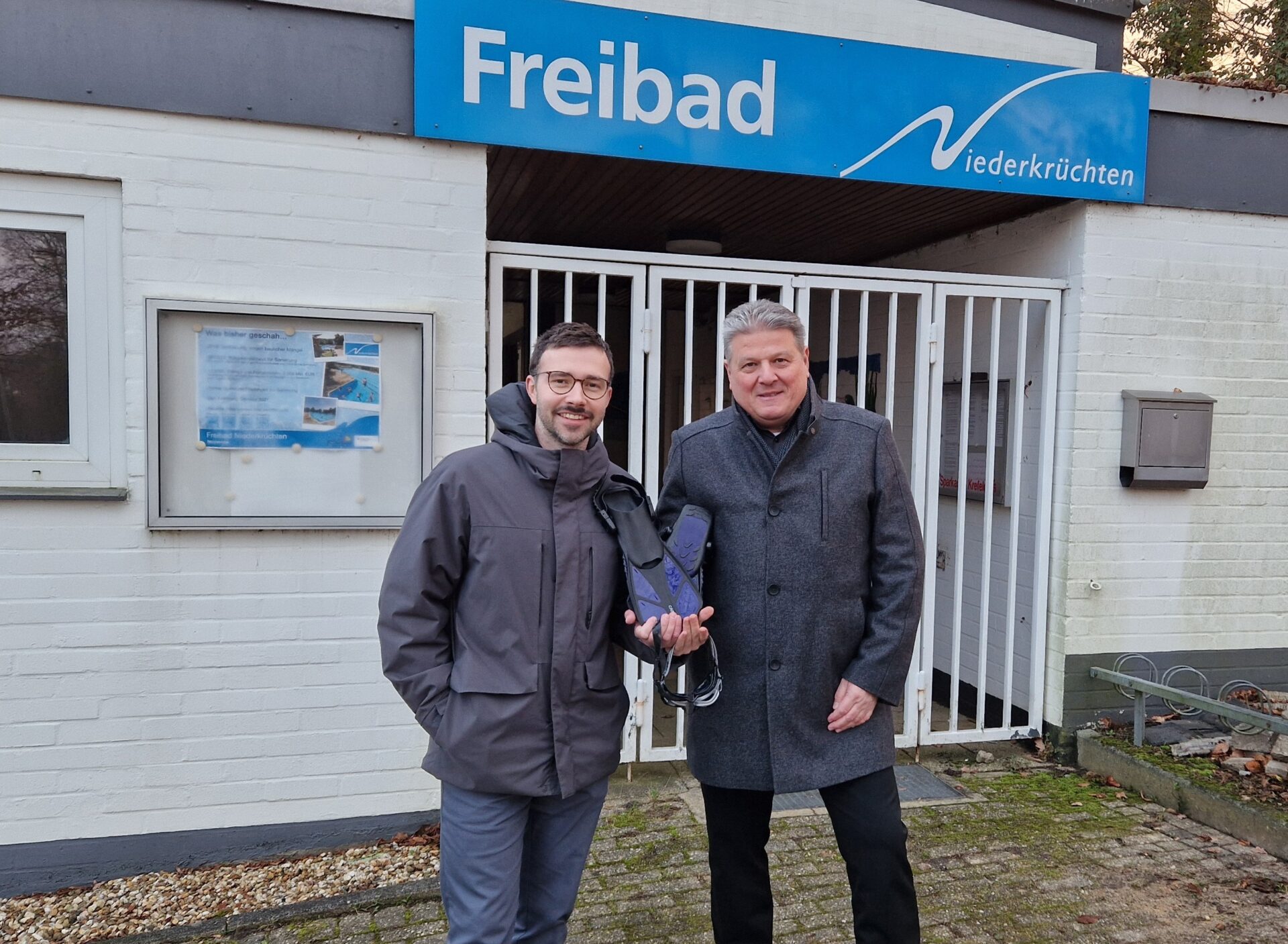 Armin Brückner (Leiter Bäderbetrieb NEW mobil und aktiv Mönchengladbach GmbH) und Niederkrüchtens Bürgermeister Thomas Ricker vor dem Freibad. Foto: Gemeinde Niederkrüchten