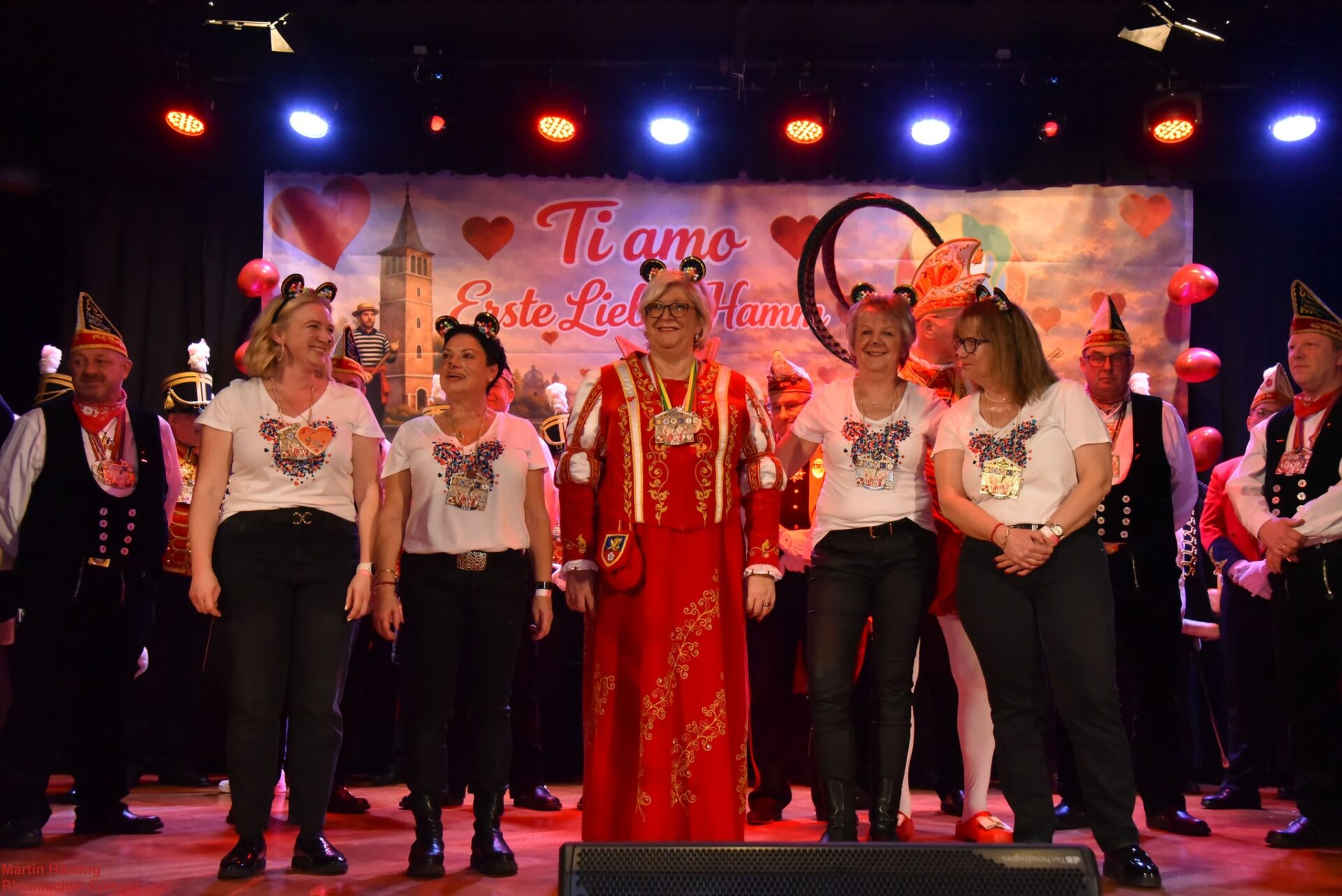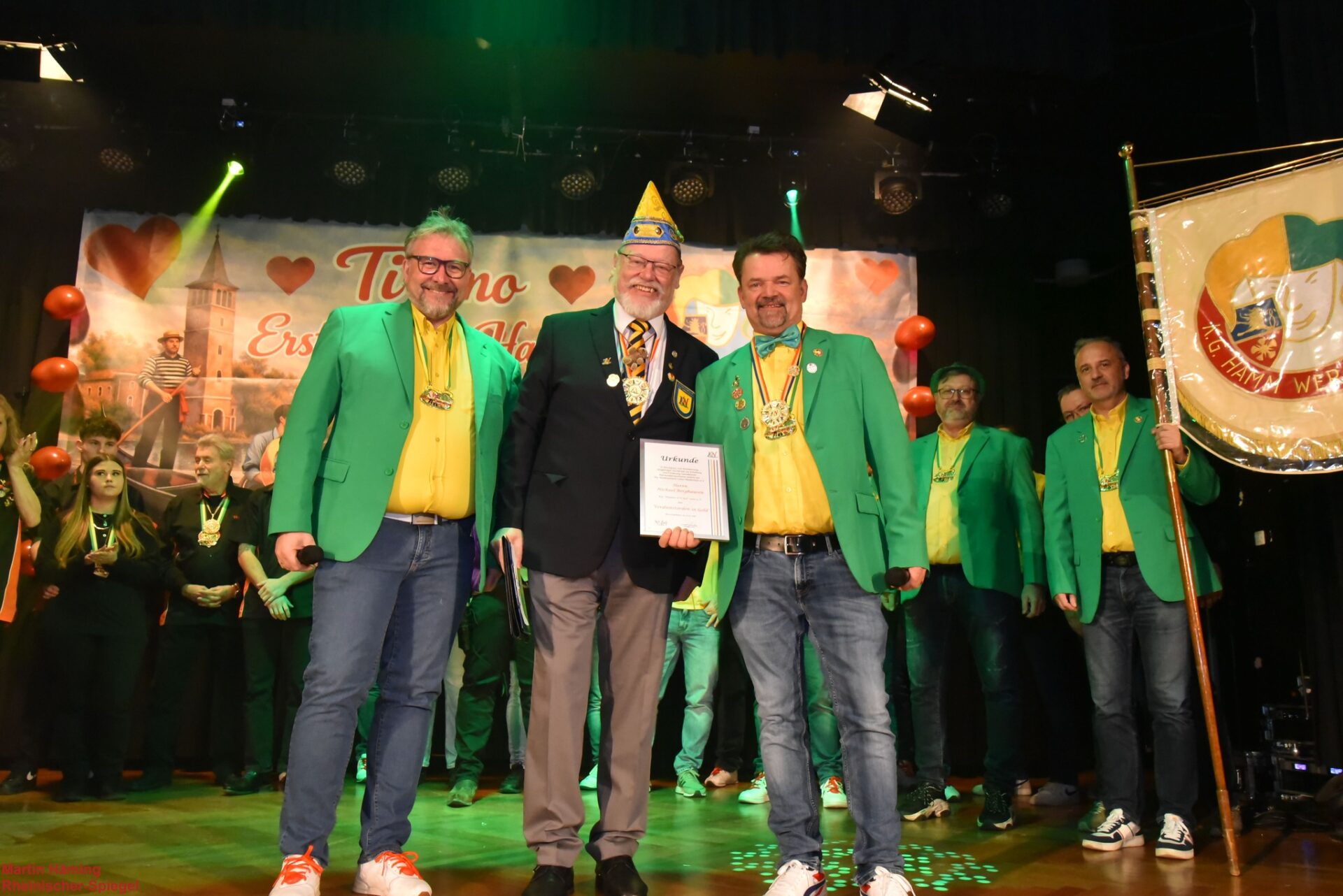 Schon der mitreißende Auftakt ließ keinen Zweifel daran, dass dieser Abend ganz im Zeichen von Leidenschaft, Tempo und karnevalistischer Begeisterung stand. Getreu dem Sessionsmotto „Ti amo – Erste Liebe Hamm“ marschierte die KG Hamm wer net mit in den festlich geschmückten Saal ein. Von der ersten Sekunde an sprang der Funke über, doch damit nicht genug – der Abend hielt gleich zu Beginn eine ganz besondere Überraschung bereit: In Würdigung und Anerkennung seiner langjährigen und herausragenden Verdienste um den Erhalt und die Förderung des heimatlichen Karnevalsbrauchtums verlieh der Karnevalsverband Linker Niederrhein e. V. den Verdienstorden in Gold an Michael Berghausen. Überreicht wurde die hohe Auszeichnung von Konrad „Konni“ Kreuzberg – zur großen und sichtlich bewegenden Überraschung des Hamm-wer-net-Präsidenten Michael Berghausen selbst.