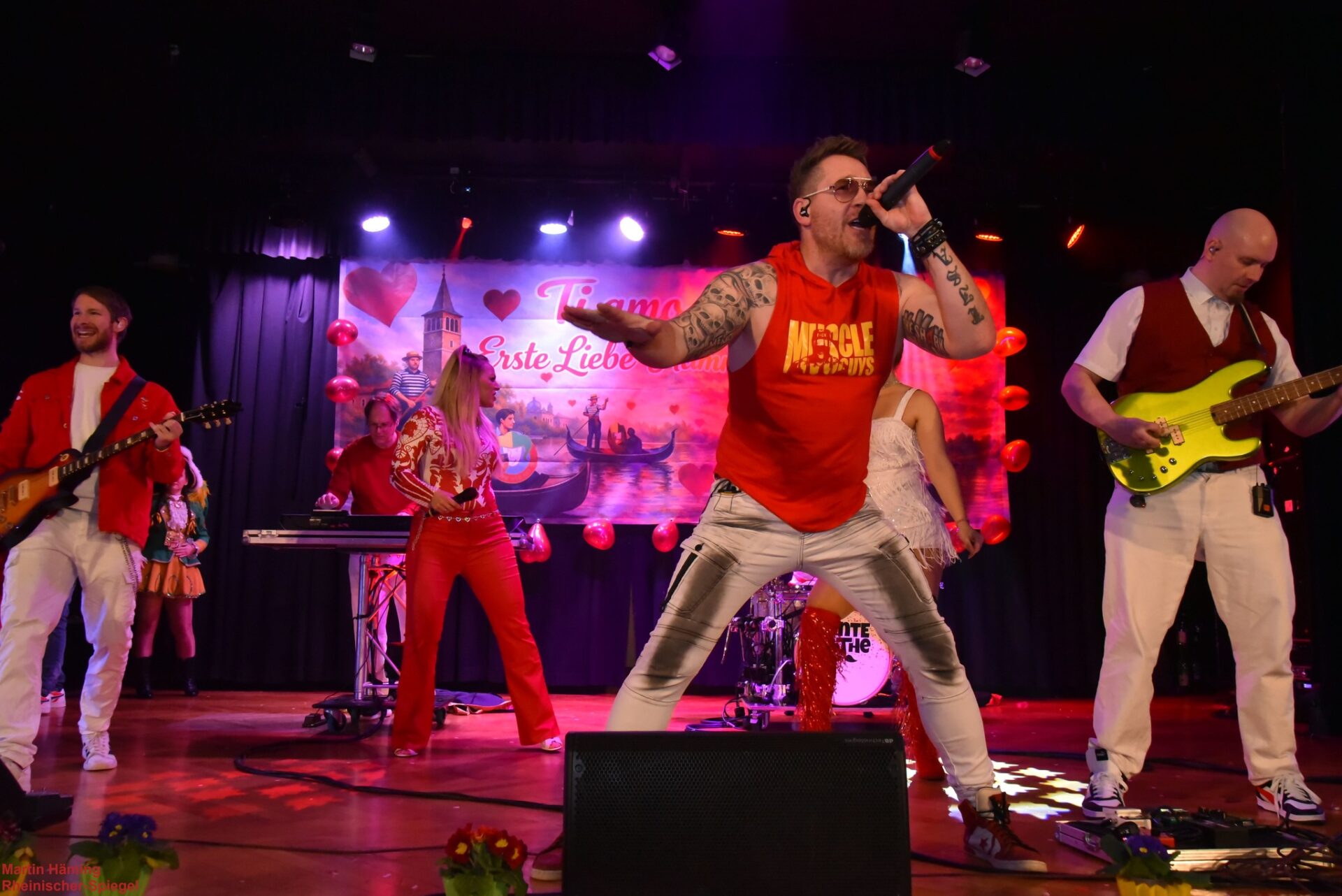 Für frischen Wind sorgte anschließend „Tante Käthe“, die Partyband aus Köln, auf der Vierscher Bühne. Tante Käthe, die sich 2019 aus der bekannten Karnevalsformation „Kölsch à la Carte“ neu formierte, brachte nicht nur ein breitgefächertes Repertoire an nationalen und internationalen Hits mit, sondern auch ein Showkonzept, das pure Unterhaltung garantiert. Frontmann Marco „The Shark“ stand mit seiner Bühnenpräsenz sofort im Mittelpunkt. Seit Jahrzehnten ein Vollprofi, zeigte er eine enorme Stimmgewalt und Ausstrahlung, ließ das Publikum an seinen internationalen Erfahrungen teilhaben und nahm jeden Song mit einer unglaublichen Energie mit auf die Bühne.