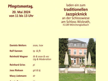 Am Pfingstmontag, 20. Mai 2024 veranstaltet der Heimat- und Verkehrsverein Wickrath in der Zeit von 11.00 bis 13.00 Uhr sein traditionelles Jazzpicknick auf der Schlosswiese (Pleasureground) und der Schlossterrasse am […]