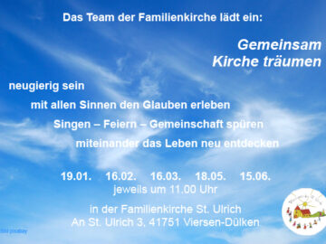 In diesem neuen Jahr wird das Team der Dülkener Familienkirche nur noch drei Sonntage als Gottesdienste für Familien mit Kindern gestalten. Für den 3. Sonntag im Monat gibt es einen […]