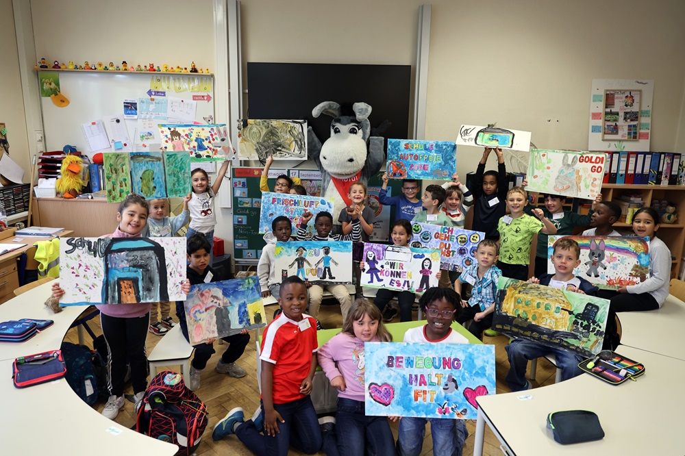 Mönchengladbach – Am Mittwoch vor der Aktionswoche (17. September) präsentierten die Kinder ihre Arbeiten gemeinsam mit Klassenlehrerin Anke Kehrberg. Unterstützt wurden sie dabei vom Maskottchen Esel Goldi der Stadtsparkasse Mönchengladbach sowie von Verkehrspolizistin Miriam Opüls, die den Kindern für Fragen rund um das Thema Verkehrssicherheit zur Verfügung stand.
