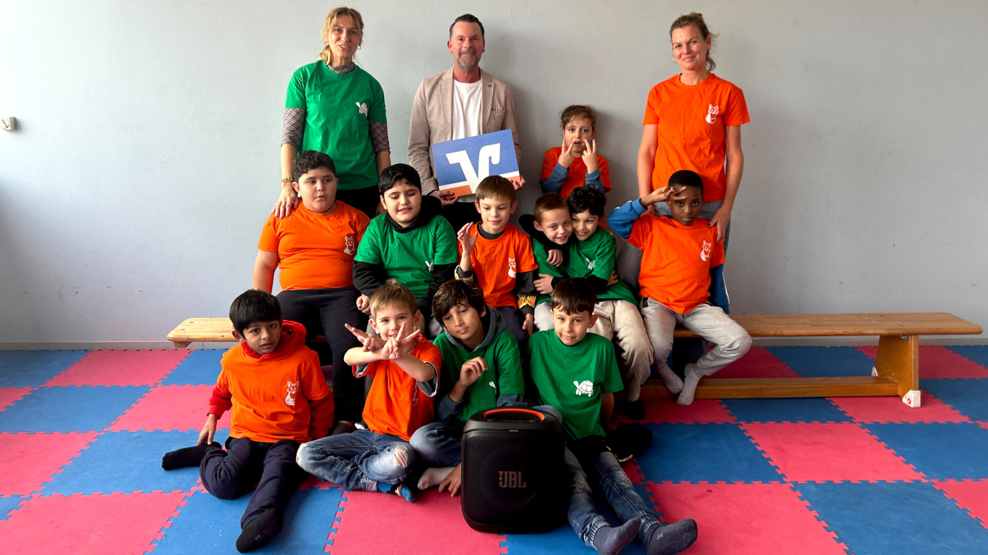 Viersen – Damit das Training und der Auftritt zu einem echten Gemeinschaftserlebnis werden konnten, haben wir das Förderzentrum gerne unterstützt. Für das Üben erhielten die Kinder eine Musikbox, mit der sie ihre Tänze einstudieren konnten. Zusätzlich gab es einheitliche T-Shirts in leuchtendem Orange und Grün, jeweils mit einem Fuchs- oder Schildkröten-Logo bedruckt – passend zu den Klassentieren. So konnten alle sichtbar als Team auftreten und ihr Zusammengehörigkeitsgefühl stärken.