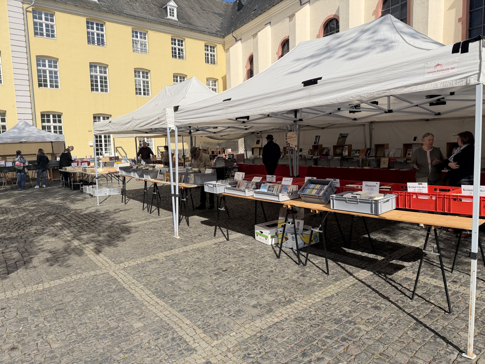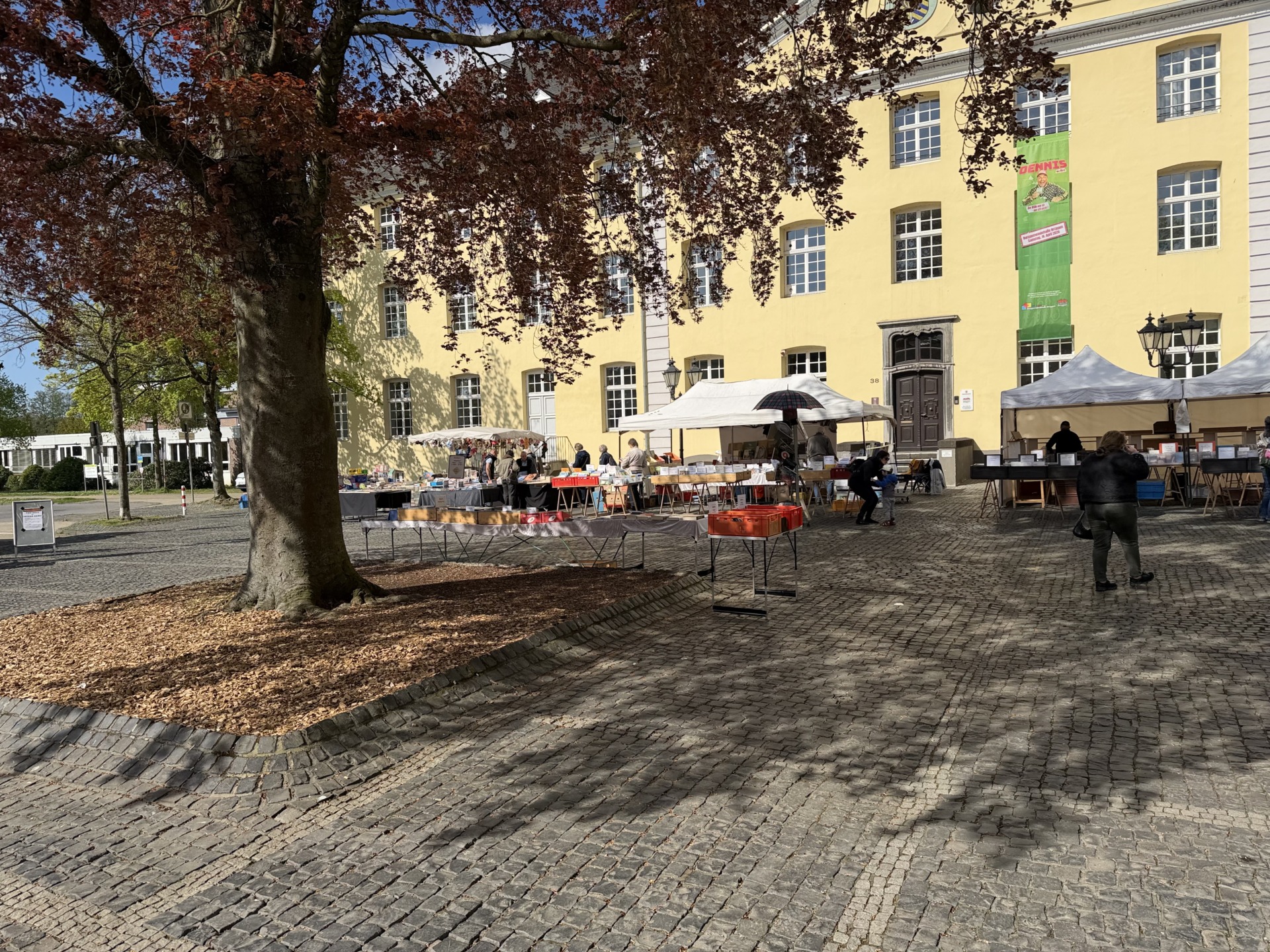 Nicht zuletzt profitierte die Veranstaltung von ihrer zentralen Lage. Moment, eigentlich findet der Büchermarkt ja auf dem Nikolausplatz statt, der am Sonntag vom „Tag der Krisenvorsorge“ belegt war, so konnte man hervorragend zwischen den Veranstaltungen wechseln und der Kreuzherrenplatz bot ausreichend Raum für die verschiedenen Stände, an denen auch unser Fotograf direkt noch ein lang gesuchtes Buch für seine Sammlung gefunden hat. Wer den Termin im April verpasst hat, erhält bereits im Sommer die nächste Gelegenheit zum Stöbern: Der kommende Büchermarkt ist für den 14. Juni 2026 geplant und findet dann wieder wie gewohnt auf dem Nikolausplatz im Zentrum von Brüggen statt, ebenfalls von 10 bis 18 Uhr. (ea)