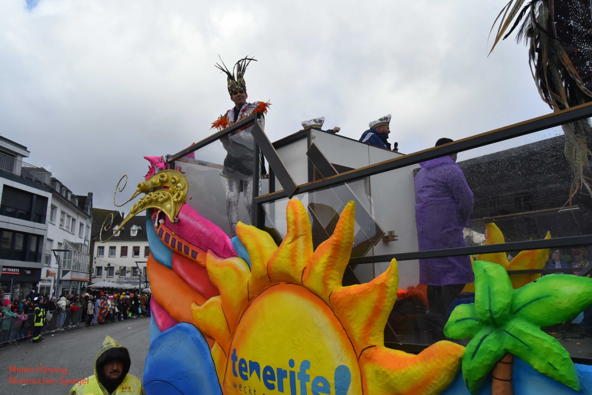 Von Beginn an prasselte ein dichter Kamelleregen auf die Menge nieder. Bonbons, Schokoriegel, Gummibärchenein und Sammelsurium aus Nützlichem sowie Kuriosem, das das Lachen der Menschen begleitete. Die Fußgruppen zeigten sich dabei besonders einfallsreich: Kunterbunte Monster mit riesigen Augen tanzten über den Asphalt, Außerirdische in glänzenden Kostümen, Gäste von der Blumeninsel Teneriffa brachten mit Federschmuck und glitzernden Kostümen südliches Temperament nach Gladbach.