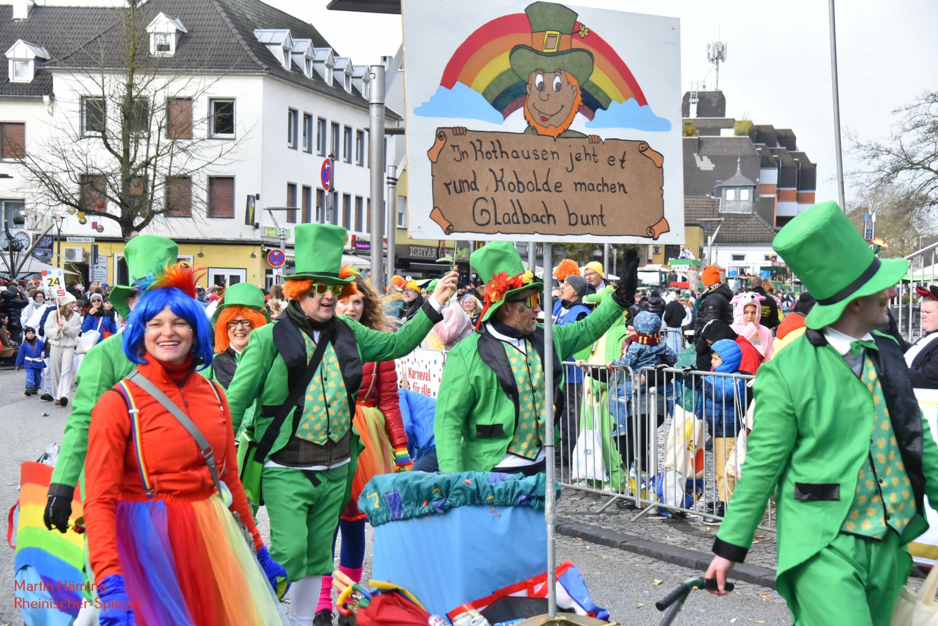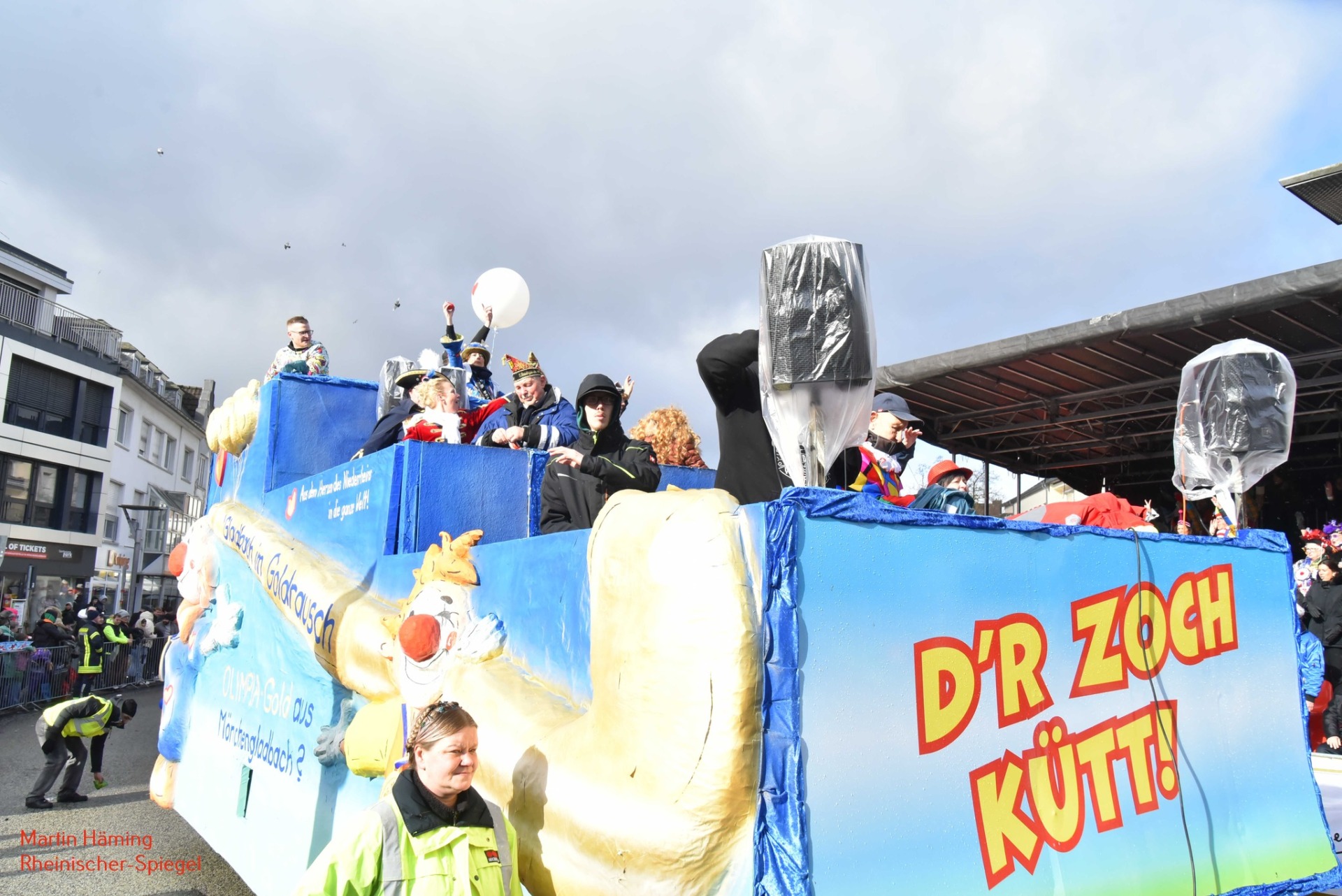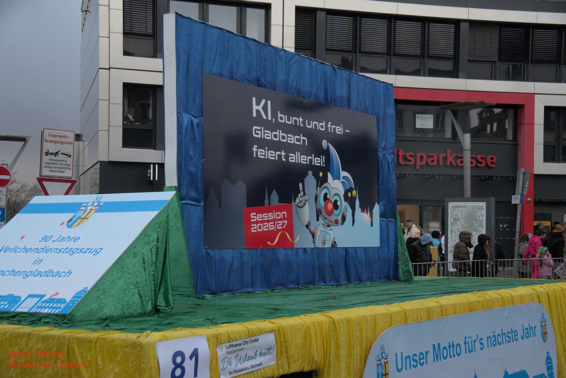 Unter dem Motto „Gladbach ist als jecke Welt, allerbestens aufgestellt“ zogen 17. Musikgruppen, 85 Fußgruppen, 47 Bagagewagen und 82 große Motivwagen durch die Innenstadt – ein Farbenrausch, ein Trommelwirbel, ein einziges bewegtes Fest.
