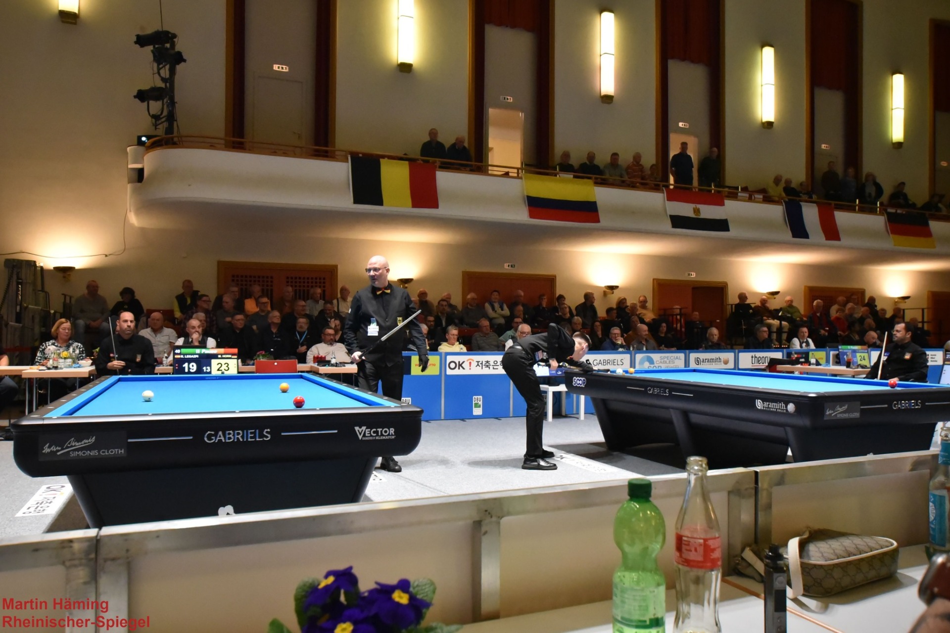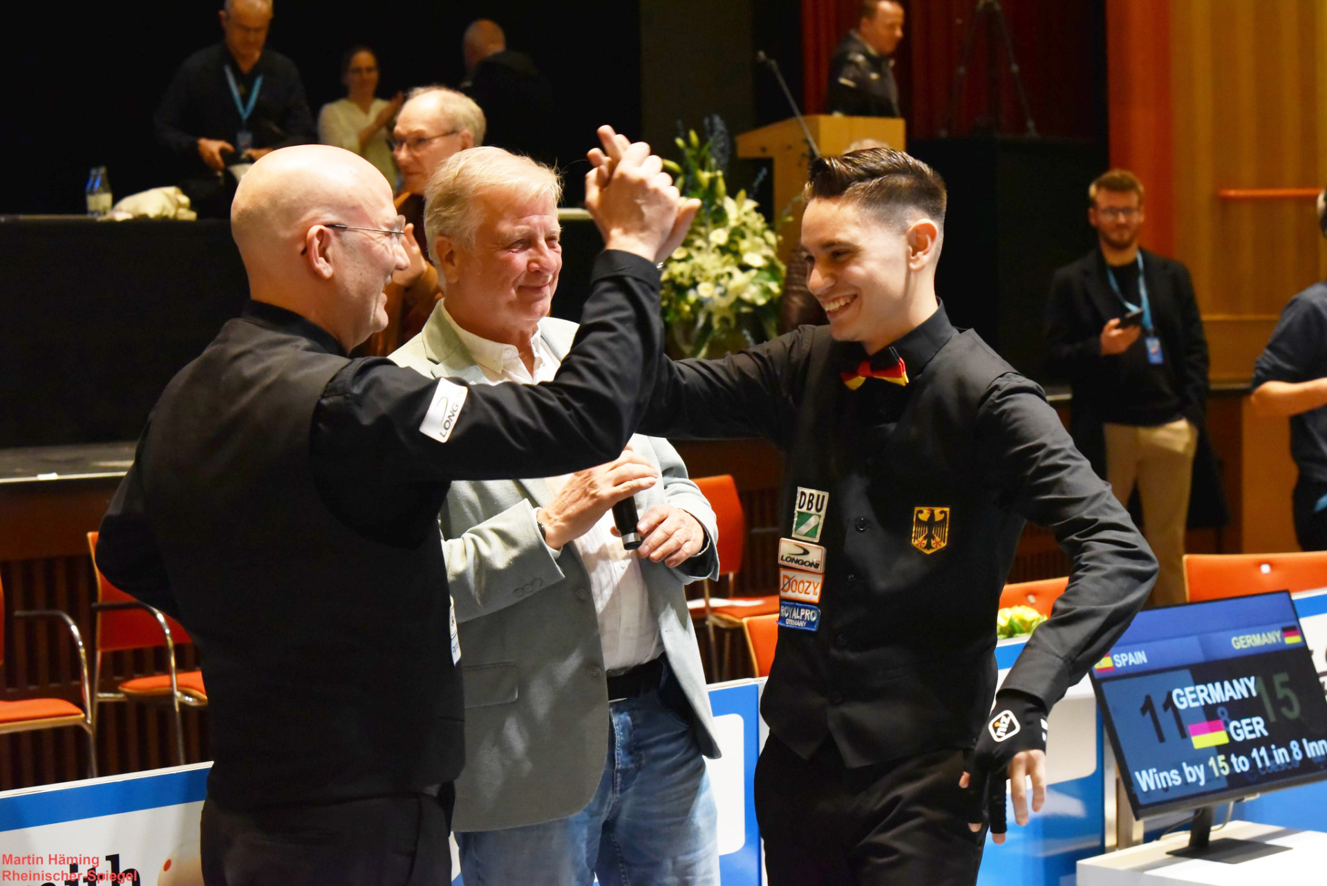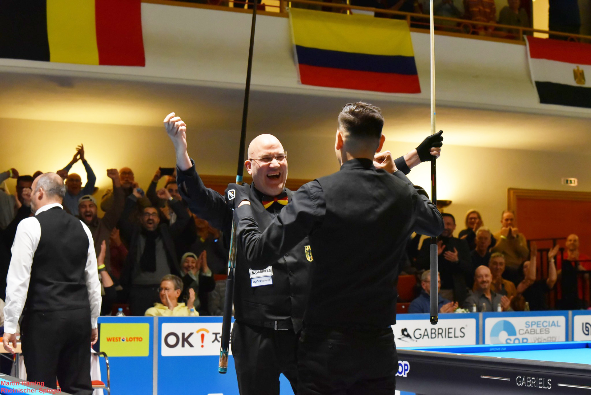 Es war später Abend, als in der Festhalle von Viersen kein Halten mehr war. Minutenlang erhoben sich die Zuschauer von ihren Plätzen, applaudierten, riefen, feierten ein deutsches Team, das soeben eines der dramatischsten Viertelfinals dieser Dreiband-Team-Weltmeisterschaft überstanden hatte.