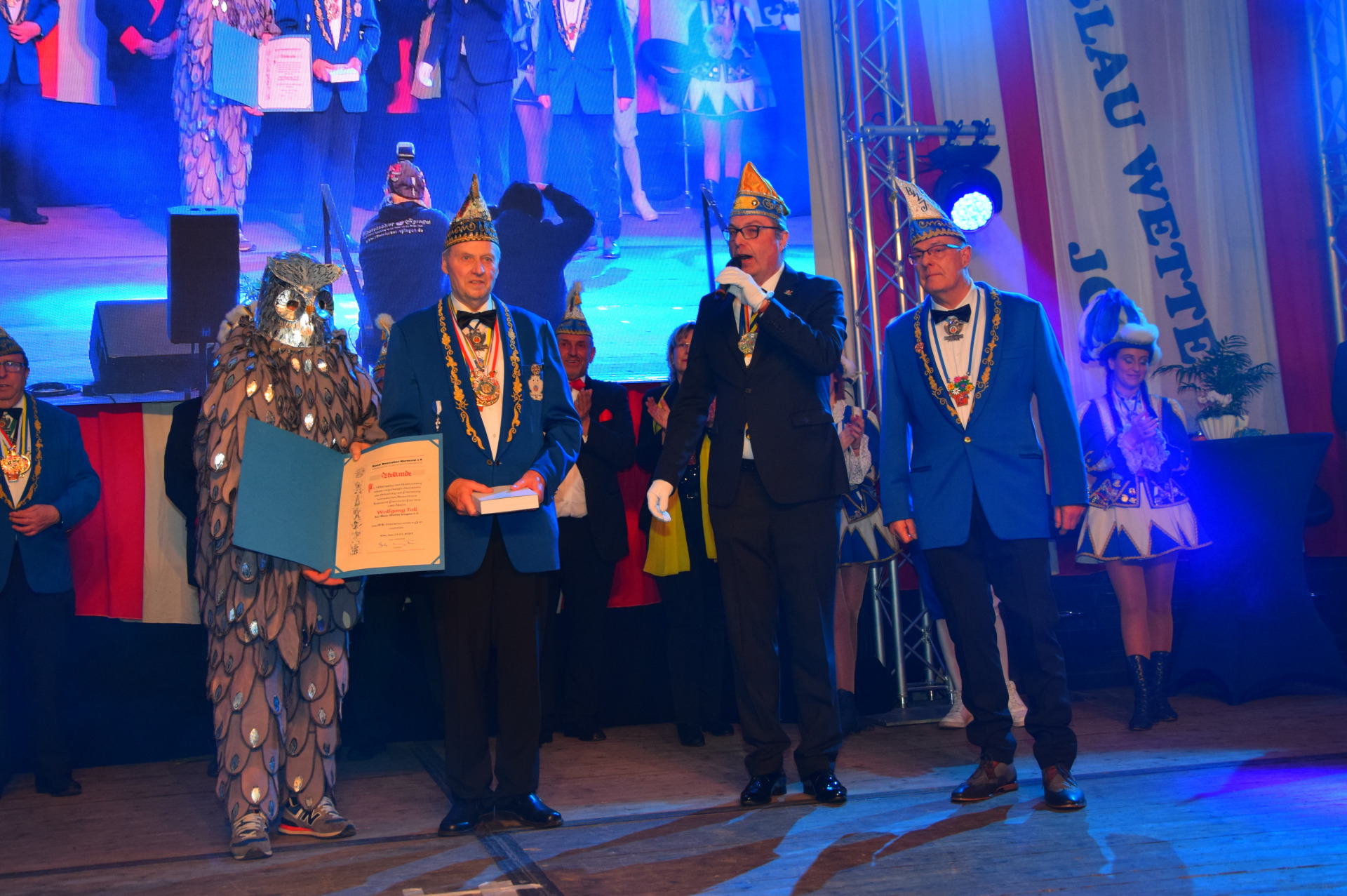 Die Ehrung bildete den perfekten Übergang zu den Tanzgarden der Karnevalsgesellschaft Blau-Wette Jonges. Ihr langes Training der vergangenen Monate wurde mit gekonnten Schritten belohnt, da spielte auch das Alter keine Rolle, wenn zu Captain Jack & Co. die Beine in die Höhe flogen. Ein großes Lob gilt in diesem Zusammenhang den Trainerinnen Sabrina Koltermann sowie Bianca Nett.