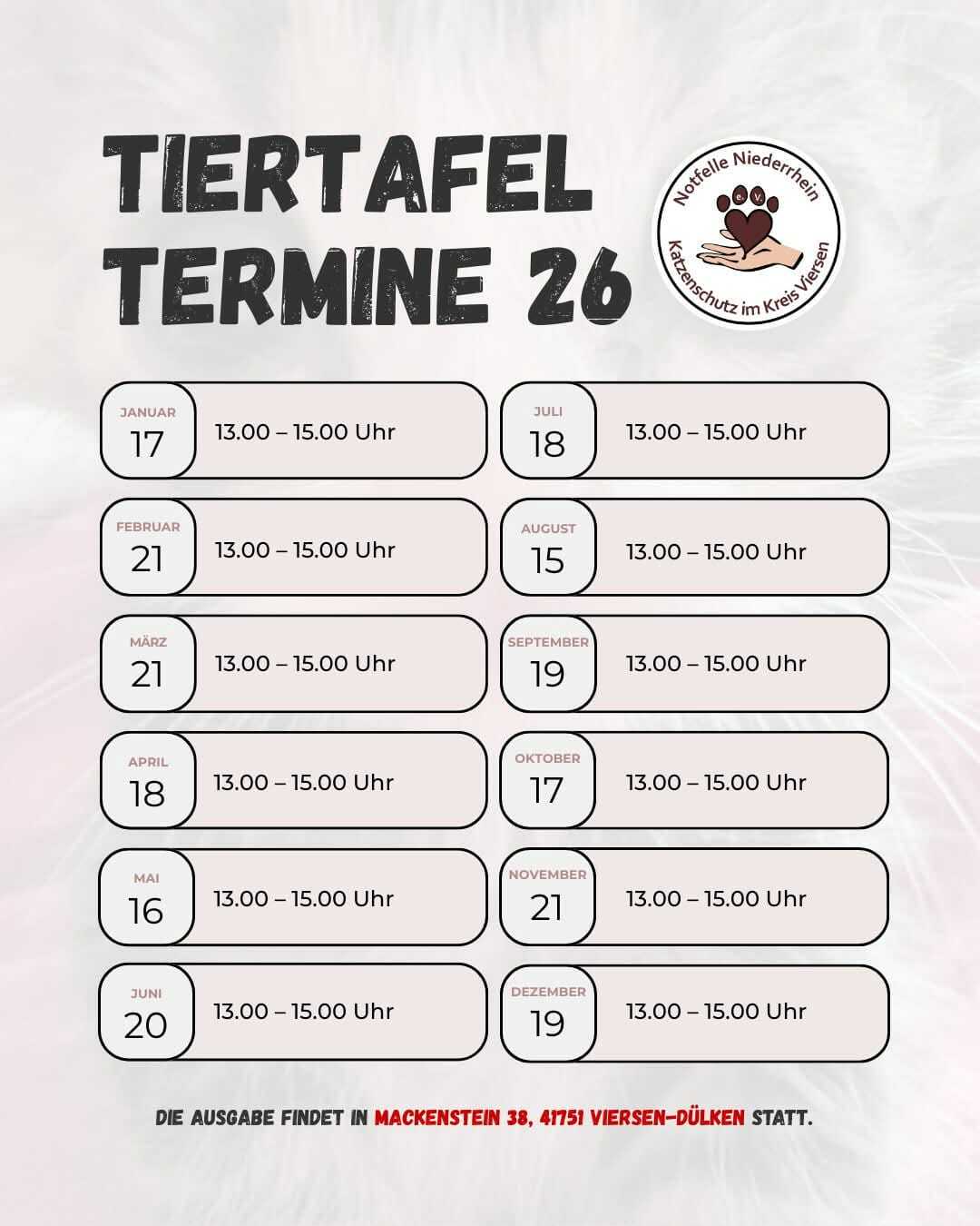 Jeden dritten Samstag im Monat, von 13.00 – 15.00 Uhr, wird das Futter bei der Tiertafel der Notfelle Niederrhein e. V. an die Besucher verteilt, die regelmäßig den Weg in das Lager Mackenstein 38, 41751 Viersen-Dülken, finden.