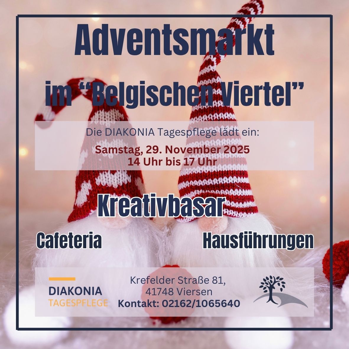 Viersen – Am Samstag, den 29. November 2025, lädt die DIAKONIA Tagespflege im „Belgischen Viertel“ von 14.00 bis 17.00 Uhr zu einem stimmungsvollen Advents- und Kreativmarkt ein. Zahlreiche Ausstellerinnen und Aussteller, die bereits bei den vergangenen, sehr gut besuchten Märkten vertreten waren, werden auch diesmal wieder dabei sein. Darüber hinaus konnten weitere kreative Anbieterinnen und Anbieter für den Markt gewonnen werden.