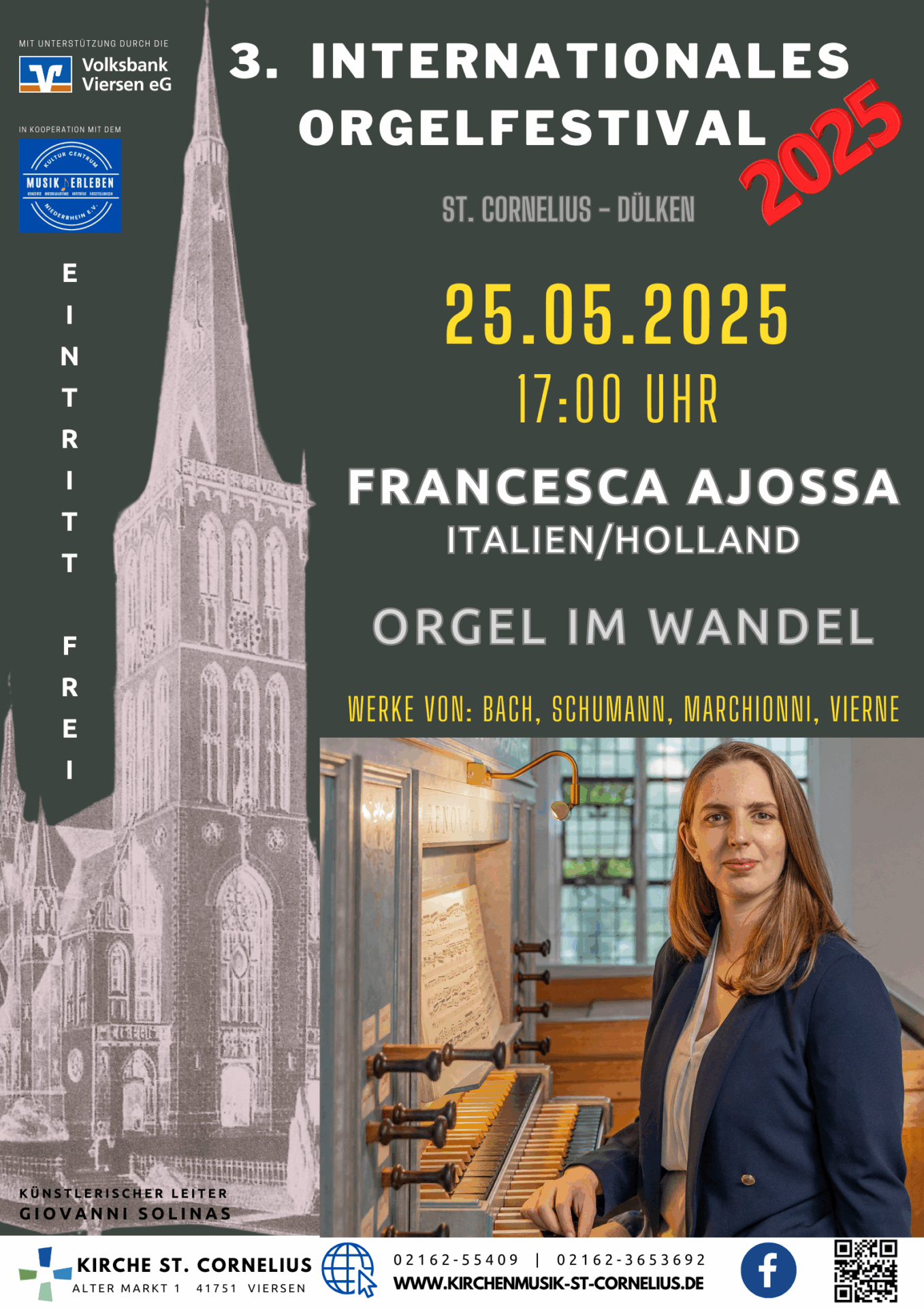 Am Sonntag, den 25. Mai 2025, ab 17:00 Uhr, setzt das 3. Internationale Orgelfestival in der Kirche St. Cornelius seine Konzertreihe mit einem besonderen Abend fort: Die italienische Organistin Francesca Ajossa, die derzeit in den Niederlanden lebt und wirkt, präsentiert ein spannungsreiches Programm unter dem Titel „Orgel im Wandel“ – ein musikalischer Streifzug vom barocken Kontrapunkt bis zur französischen Orgelsinfonik des 20. Jahrhunderts.