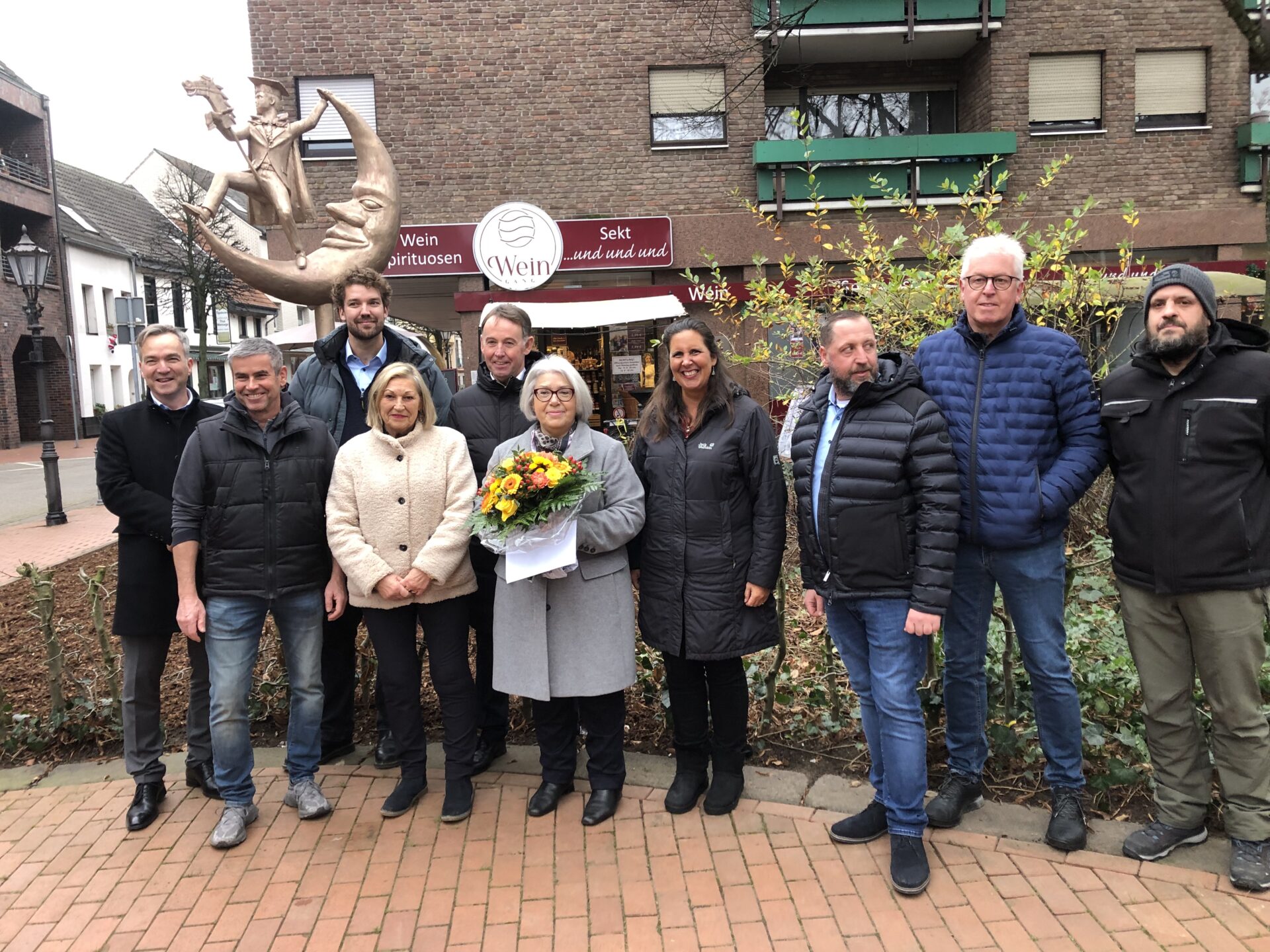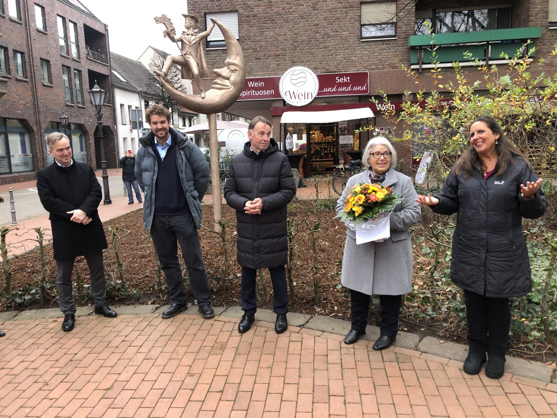 Viersen-Dülken – Bestes Winterwetter und sogar trocken. Perfekt, um noch zum Ende des Jubiläumsjahres des Verkehrs- und Verschönerungsvereins Dülken e. V. zu einem ganz besonderen Termin einzuladen, denn auf dem Peterboroughplatz wurde der „Dülkener Mann im Mond“ erstmals der Öffentlichkeit präsentiert. Mehr als 50 Bürgerinnen und Bürger waren der Einladung gefolgt und verfolgten die Enthüllung des Kunstwerks, das künftig die Aufenthaltsqualität im Bereich vor der Venloer Straße prägen wird. Gleichzeitig wurden Teile der angrenzenden Grünanlage neu gestaltet und aufgewertet.