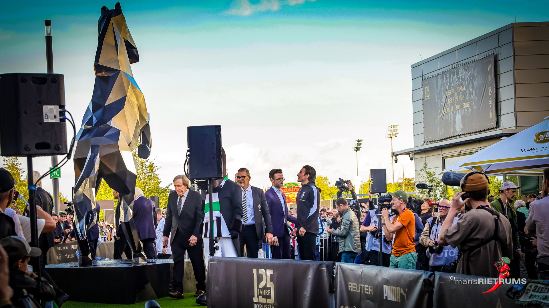 Was dann sichtbar wurde, war mehr als nur Metall: eine 4,50 Meter hohe Fohlenfigur aus Bronze – kraftvoll, aufrecht, detailreich. Sie steht sinnbildlich für das Selbstverständnis eines Klubs, der sich stets zwischen jugendlicher Dynamik und traditionsreicher Standfestigkeit bewegt hat.