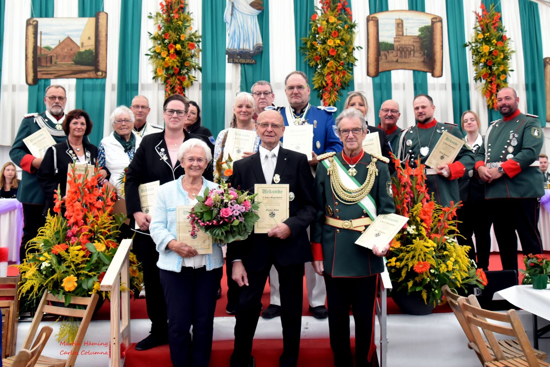 Darüber hinaus ehrte die Bruderschaft eine beeindruckende Reihe von Jubilarinnen und Jubilaren: Für 25 Jahre Mitgliedschaft wurden Sabrina Boeken, Annemarie Goletz, Timm Küsters, Michael Mertens, Klaus Henskes, Nadine Pitzen-Hardie, André Schiffer sowie Jeanette und Richard Zirngast ausgezeichnet. Auf 40 Jahre Engagement konnten Martin Häming (Ja, genau, unser „Stadtfotograf“. Herzlichen Glückwunsch von der gesamten Redaktion, lieber Martin), Petra Fuß, Käthe Navratil und Karin Wolters zurückblicken, während Gabriele Zwolicki für 50 Jahre Mitgliedschaft geehrt wurde. Für 60 Jahre stand Heidi Mihm im Rampenlicht und besondere Ehrungen für 70 Jahre Treue erhielten Cornelia Bürger, Erich Jungblut, Norbert und Renate Mihm.
