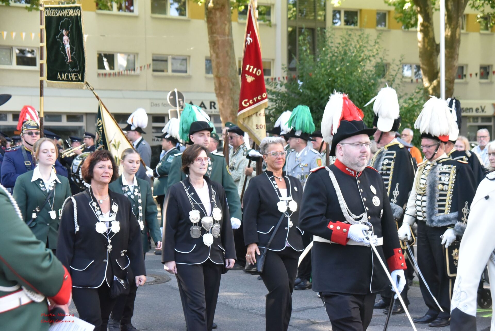 Im Anschluss entfaltete sich vor der Kirche das bekannte farbenfrohe Bild, welches so viele Zuschauer und Schützen ins Rahser zieht: Musikkapellen, Schützenzüge und Ehrengäste boten bei der großen Musikdemonstration und Parade ein eindrucksvolles Schauspiel, das von zahlreichen Zuschauern am Straßenrand begeistert verfolgt wurde.