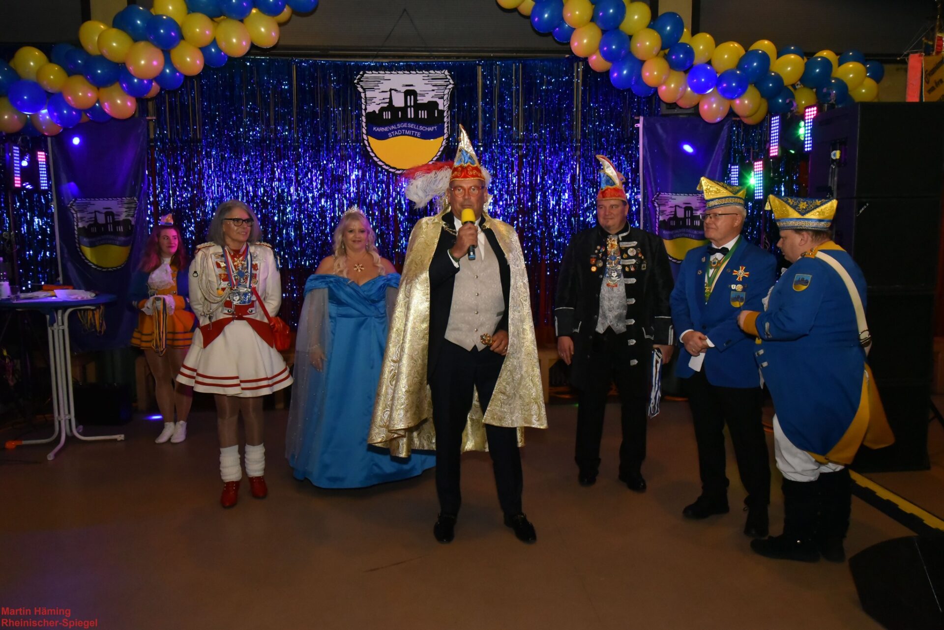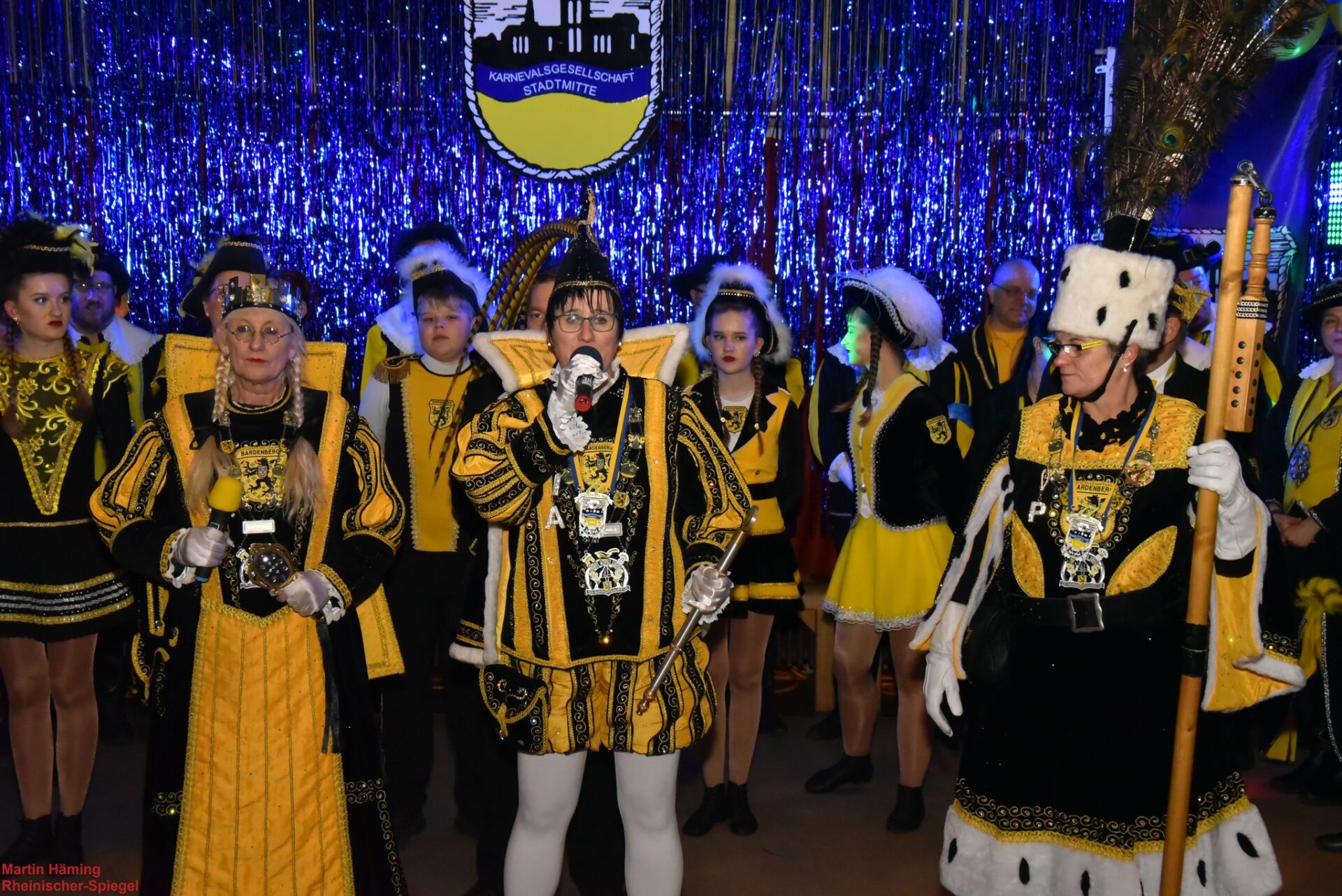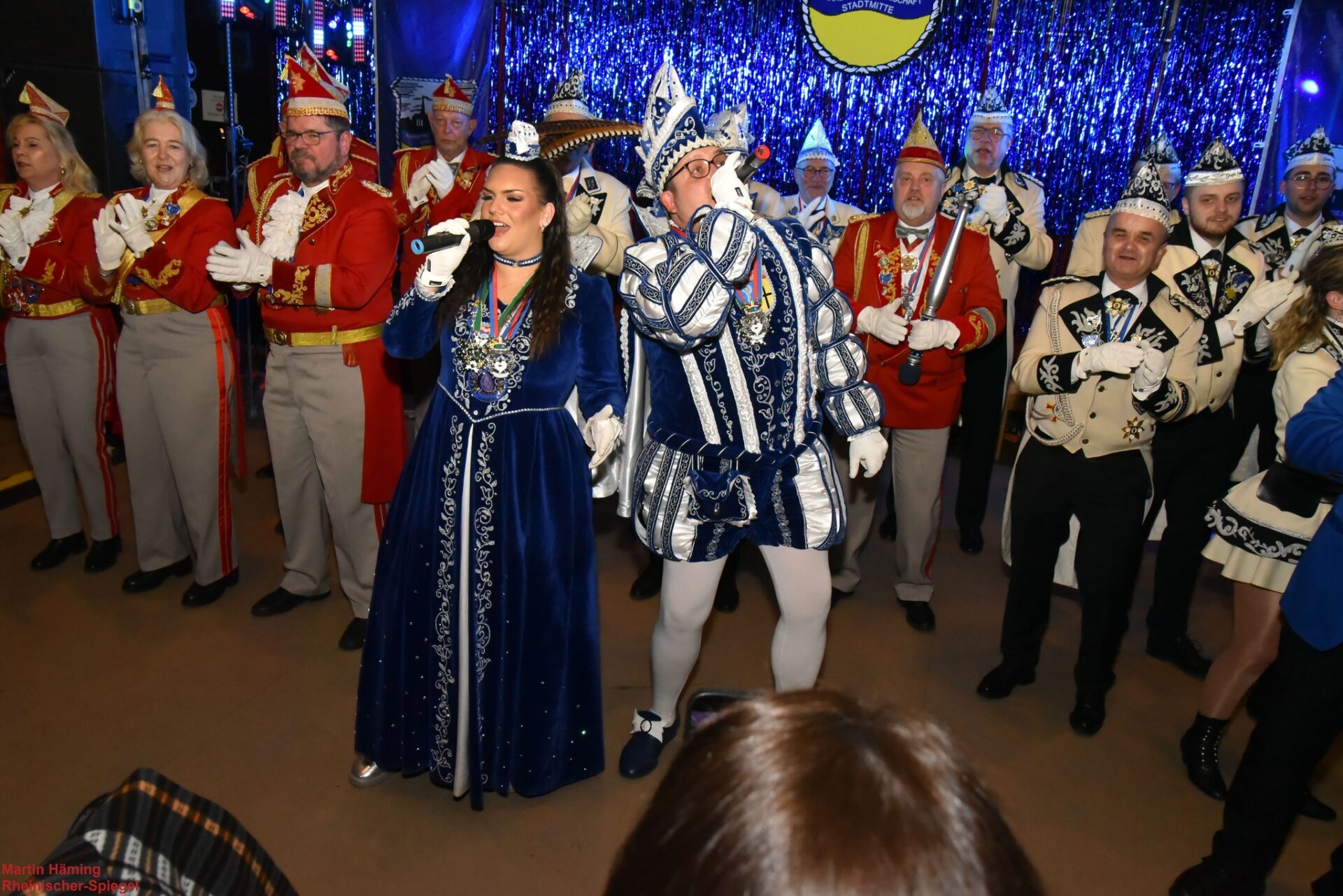 Apropos Höhepunkte, zu denen gehörte natürlich unangefochten auch das Prinzenpaar der Stadt Mönchengladbach 2025/26: Prinz Marc I. (Thönes) und Prinzessin Niersia Janine (Thönes), begleitet von Hofmarschall Rolf Gaden, Adjutant des Prinzen Stefan Neus und Adjutant der Prinzessin Michael Böhm. Auch sie ließen sich ihren Auftritt am Mikrofon nicht entgehen und so folgte nach einem Interview ein Ständchen für ihr närrisches Volk.