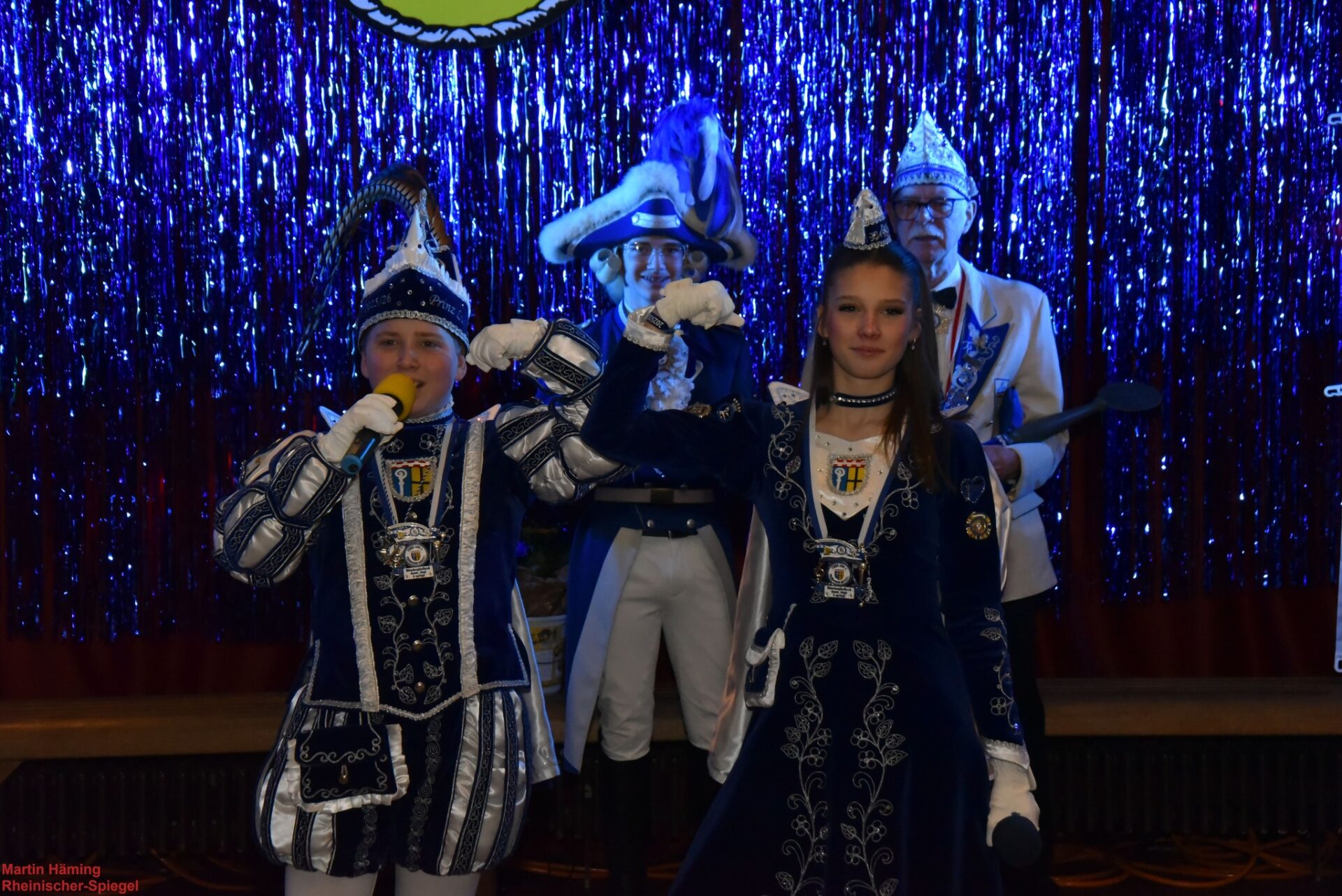 Dann erklang Kinderlachen auf besondere Art: Das Kinder-Prinzenpaar der Stadt Mönchengladbach 2025/26 — Prinz Luis I. (Ewerhardy) und Prinzessin Annick I. (Homann) — betrat die Bühne, flankiert von Hofmarschall Hajo Hering und Adjutant Nicklas Fondermann. Die „Kleinen“ sind dabei allerdings schon ganz große Profis auf der Bühne und längst alte Hasen am Mikrofon.
