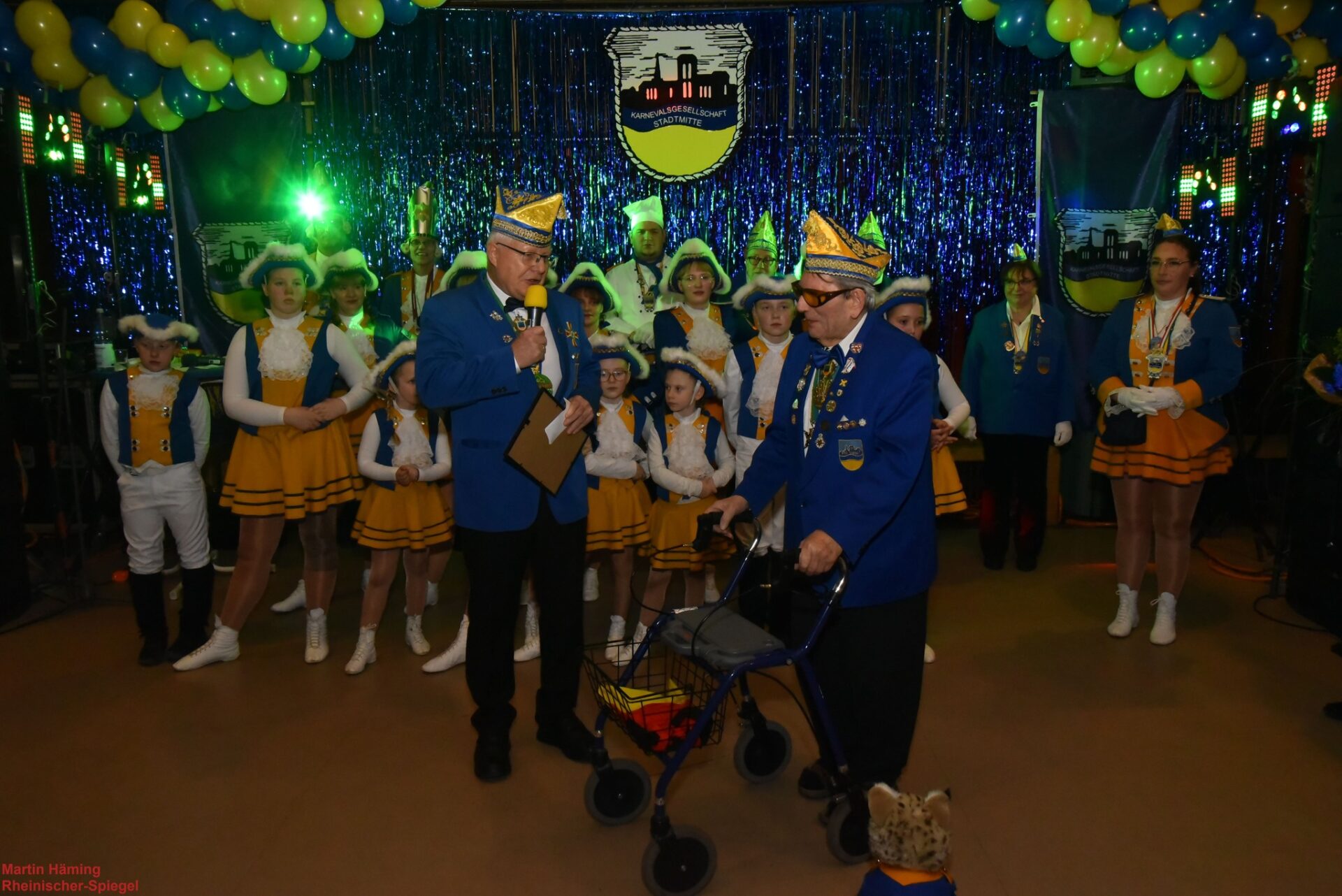 Das erste Scheinwerferlicht nach dem Einzug der Gesellschaft fiel dabei auf die Kindergarde der KG Stadtmitte, an die sich die Tanz- und Funkengarde anschloss. Was schon beim jecken Nachwuchs fantastisch aussah, spiegelte sich bei den Großen in präziser Schrittfolge wieder. Doch was wäre ein solcher Abend ohne die Anerkennung für verdiente Karnevalisten. Ernst Braun wurde für 70 Jahre Vereinszugehörigkeit mit einer Urkunde geehrt. Die Ehrung war nicht nur Formalakt, sondern eine spürbar emotionale Widmung — Hände wurden gereicht, Augen wurden feucht, und das Publikum antwortete mit langanhaltendem Applaus, der dem Jubilar eine Bühne voller Respekt schenkte.
