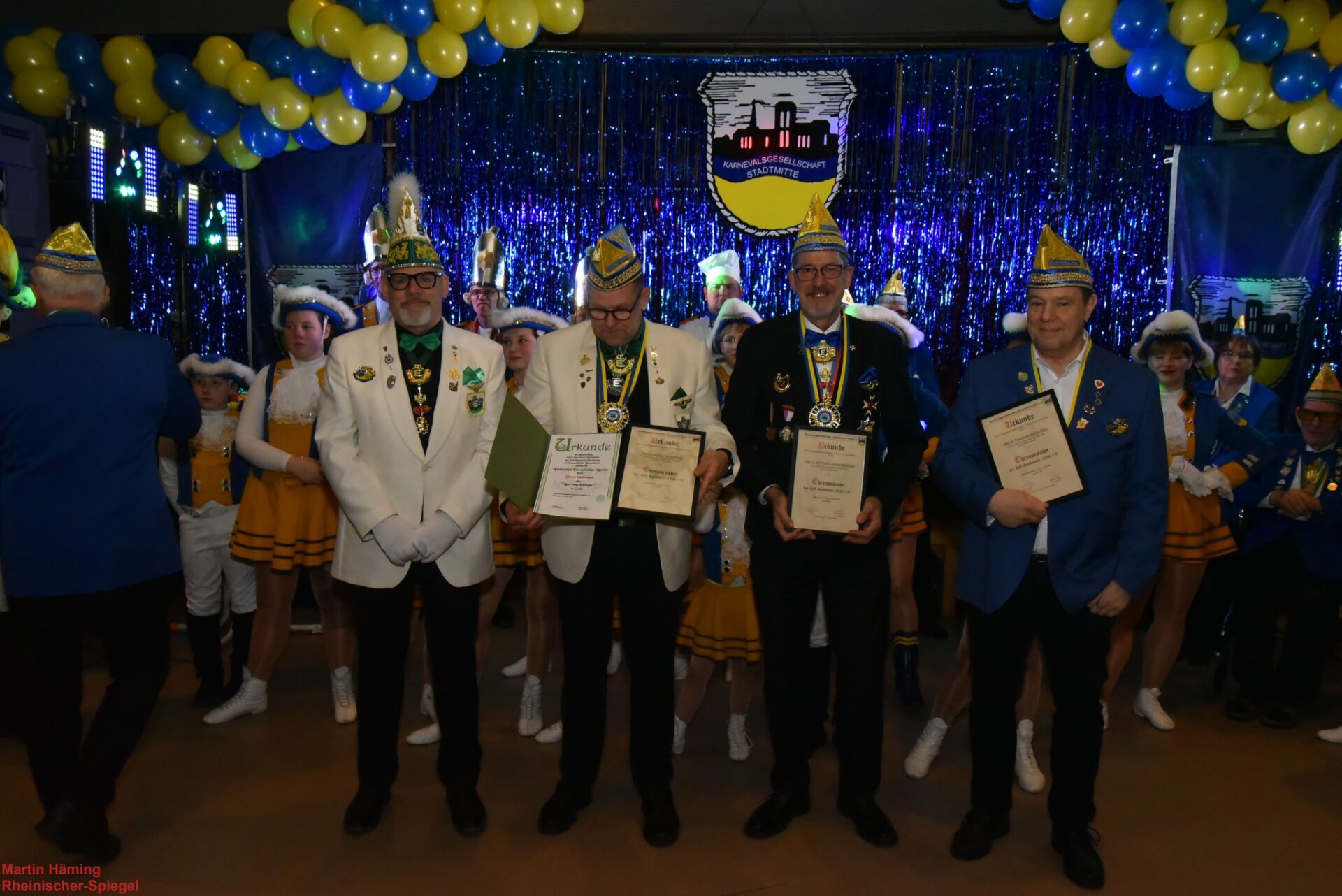 Besondere Aufmerksamkeit galt an diesem Abend der Auszeichnung von Victor Schreiner, der für sein jahrzehntelanges Wirken im Karneval eine der höchsten Ehrungen erhielt. Ihm wurde der „Narr von Europa in Gold“ durch die Föderation Europäischer Narren Deutschland e.V. (FEN) verliehen. Die Auszeichnung überreichte der Deutschlandpräsident der FEN, Christian Schreiner, persönlich. Die Föderation, die ihren Ursprung im Jahr 1975 ausgerechnet in Mönchengladbach hat, war an diesem Abend zu Gast bei Freunden: Seit rund 20 Jahren verbindet sie eine enge Beziehung zur KG Stadtmitte. Victor Schreiner, FEN-Mitglied und Präsidiumsrepräsentant, wurde damit für über 40 Jahre aktives karnevalistisches Engagement geehrt.