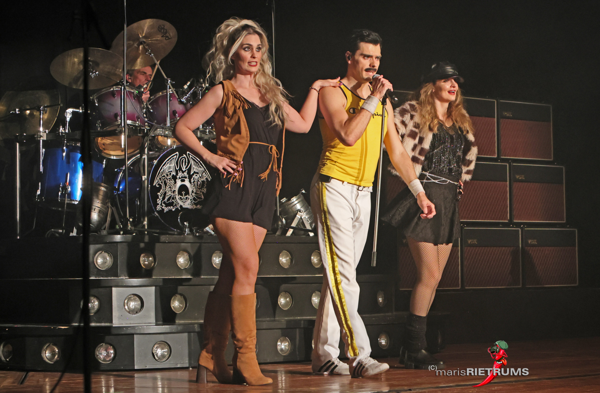 Im Zentrum steht Josch Hinder, seit 2025 Frontmann der Formation, dessen Präsenz den Raum sofort bindet. Es ist nicht allein die stimmliche Kraft, die auffällt – es ist die Fähigkeit, Haltung, Gestik und jene schwer greifbare Aura zu transportieren, die einst die größten Bühnen der Welt beherrschte. Hinder bewegt sich mit einer Selbstverständlichkeit zwischen Nähe und Inszenierung, zwischen Ekstase und Kontrolle, die das Publikum immer wieder in Bann zieht. Seine Stimme trägt mühelos durch die komplexen Arrangements, wechselt zwischen Pathos und Leichtigkeit und bleibt dabei erstaunlich nah am Original, ohne in bloße Imitation zu kippen.