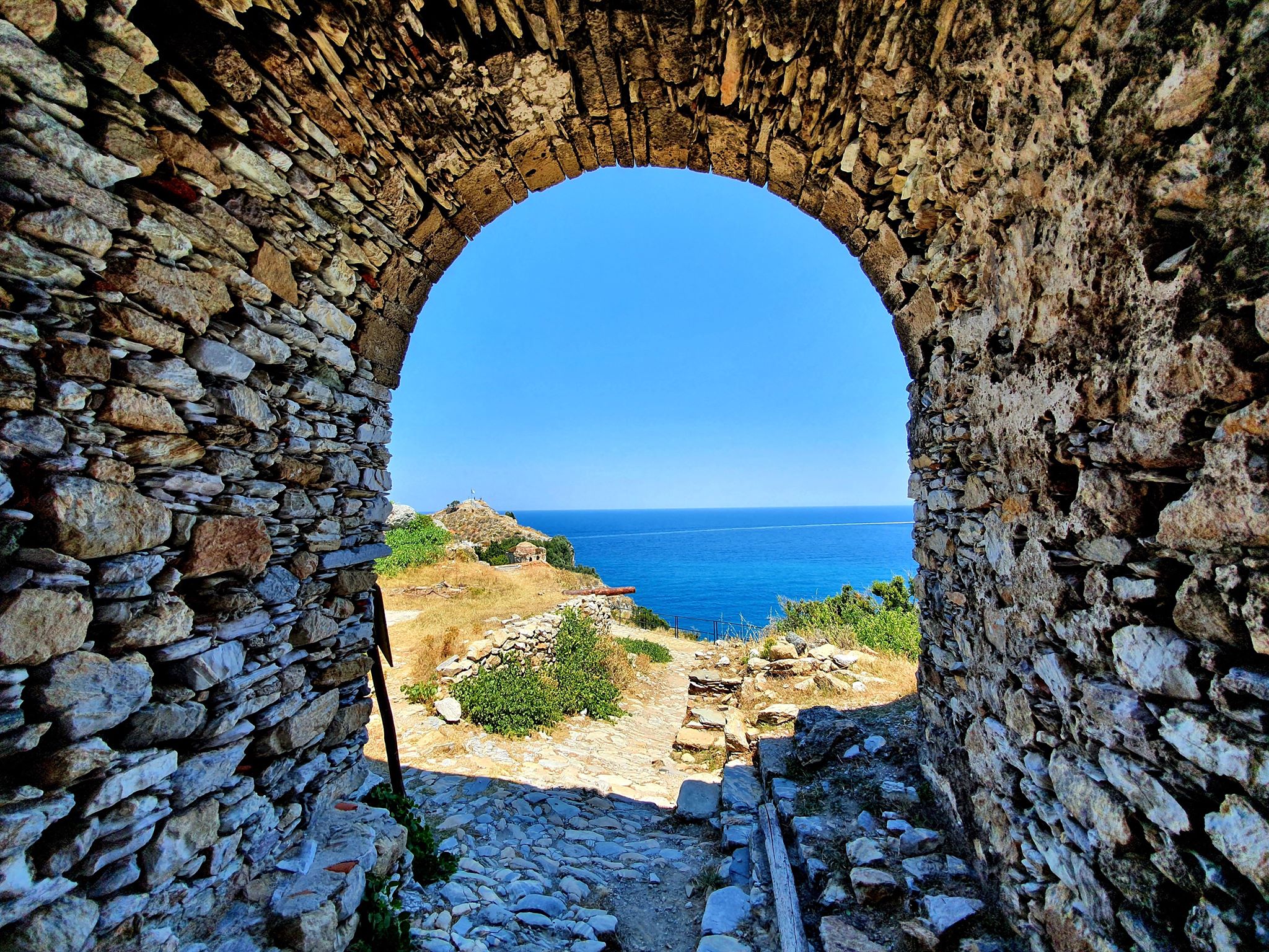 Skiathos/Griechenland – Unterhalb der ursprünglichen, mittelalterlichen Stadt Skiathos, am nördlichsten Punkt der Insel lockt nicht nur einer der schönsten Strände des Eilands, wer dem schmalen Weg entlang der Klippen folgt, der wird mit einem traumhaften Blick von dem Kastro auf das kristallklare Wasser belohnt.