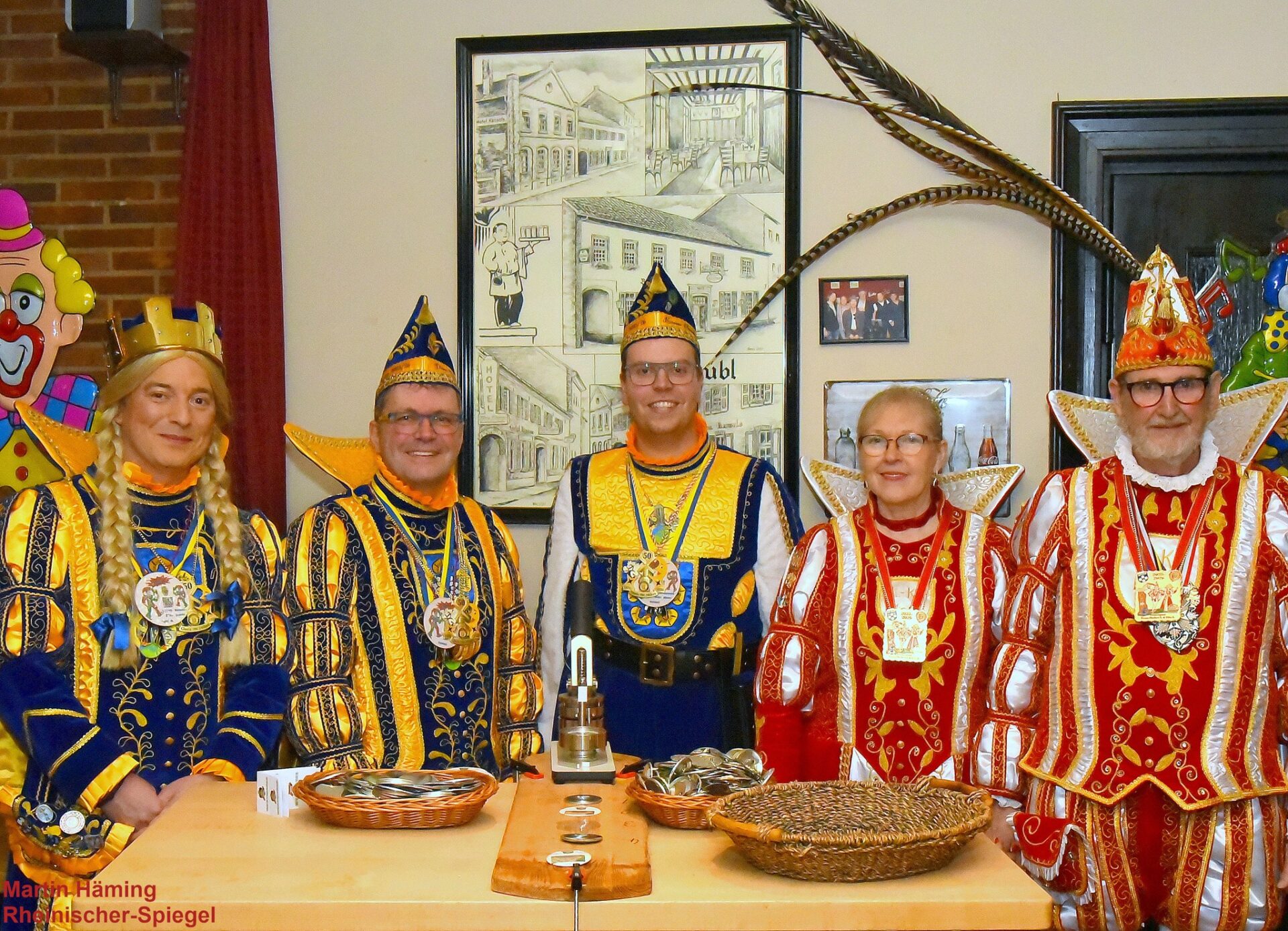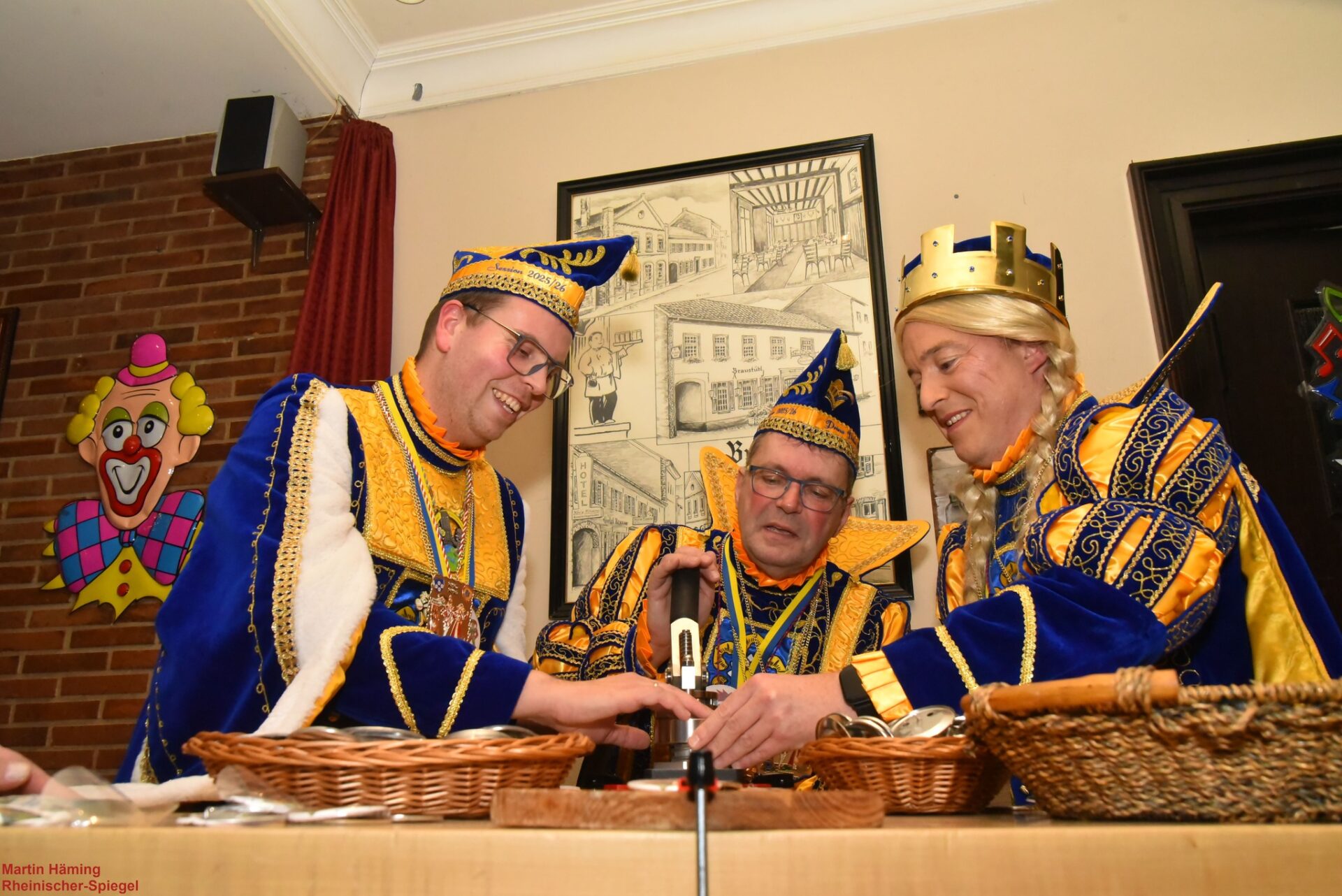 Die Stoppuhr lief, die Spannung stieg. Kaum war das Startsignal gegeben, flogen Papierrohlinge, Rückseiten und Pressstempel im Takt der Musik durch die Hände des Dreigestirns. Konzentriert, lachend, anfeuernd – so präsentierten sich die drei Tollitäten, die in dieser Session erstmals gemeinsam als Dreigestirn die Nettetaler Jecken durch den Karneval führen. Unterstützt von Helmut Schatten, der routiniert den Ablauf koordinierte, entwickelte sich ein wahres Press-Spektakel, bei dem keine Sekunde verschenkt wurde.