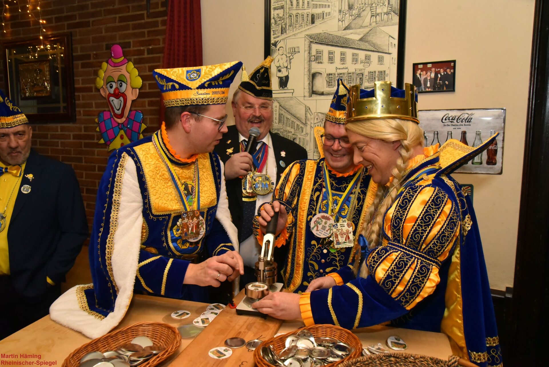 Das Ergebnis konnte sich sehen lassen: 105 Buttons waren in der kurzen Zeit entstanden. Helmut Schatten wandelte die bunten Erinnerungsstücke anschließend in bare Münze um. Am Ende des Abends stand ein Erlös von 582,75 Euro auf dem Zettel – eine Summe, die einem Kindergarten in der Region zugutekommt und den karnevalistischen Einsatz mit sozialem Engagement verbindet.
