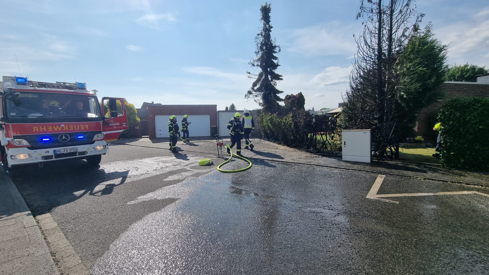 Mönchengladbach – Beim Eintreffen der Feuerwehr bestätigte sich das gemeldete Lagebild: Auf rund 15 Metern brannten eine dichte Hecke sowie zwei angrenzende Bäume in voller Ausdehnung. Die Flammen drohten, auf angrenzende Gebäude überzugreifen. Durch den schnellen und gezielten Einsatz eines C-Strahlrohres konnte die Ausbreitung des Feuers verhindert und der Brand zügig unter Kontrolle gebracht werden.