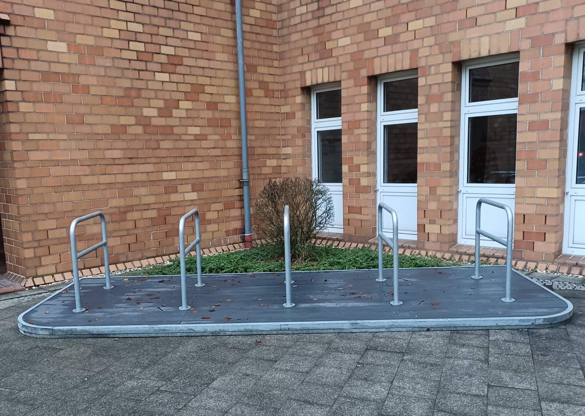 Die flexibel versetzbare Plattform hat ungefähr die Größe eines PKW-Stellplatzes (2×5 Meter) und integriert insgesamt fünf aufgebaute Anlehnbügel, zum sicheren Anschließen von bis zu zehn Fahrrädern.